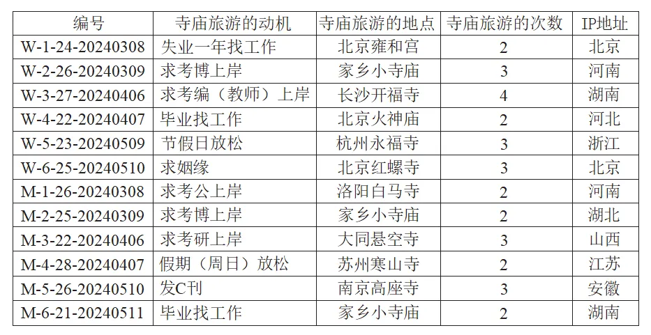自2020年11月至2024年6月,笔者对小红书平台进行了近四年的使用与观察。在这一过程中,笔者体验并注意到,与抖音、微博等其他社交媒体应用相比,小红书在信息的真实性与价值度方面呈现出显著的优势,这可能与小红书独特的社区文化氛围和用户互动模式有关。聚焦寺庙旅游在当代青年中火爆出圈这一社会现象,自2023年6月始,笔者在小红书平台对该现象进行了近一年的系统观察,关注了近百名博主,对其在平台上分享的寺庙旅游相关内容进行了整理与分析,形成了近十万字的文本资料。本文采用质性研究方法,研究对象是近半年有过寺庙旅游经历的青年群体。根据线上收集资料的完整程度以及质性研究对样本数量的要求,最终选择对12位有过2次及以上寺庙旅游经历的青年进行访谈,每人的访谈时间均在1小时以上,受访者基本信息参见表1。受访者编号为M(W)-数字1-数字2-访谈时间,M代表男性,W代表女性,数字1按照资料整理过程中的顺序排列,数字2为受访者的年龄。值得强调的是,本文在网络民族志方法的应用中,严格遵守了研究伦理原则,注重对研究的合法性、道德性和参与者隐私的保护,以确保研究的科学性、有效性和可信度。