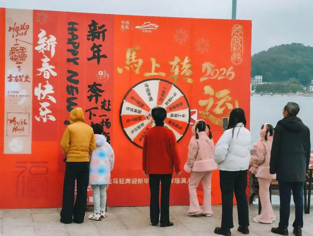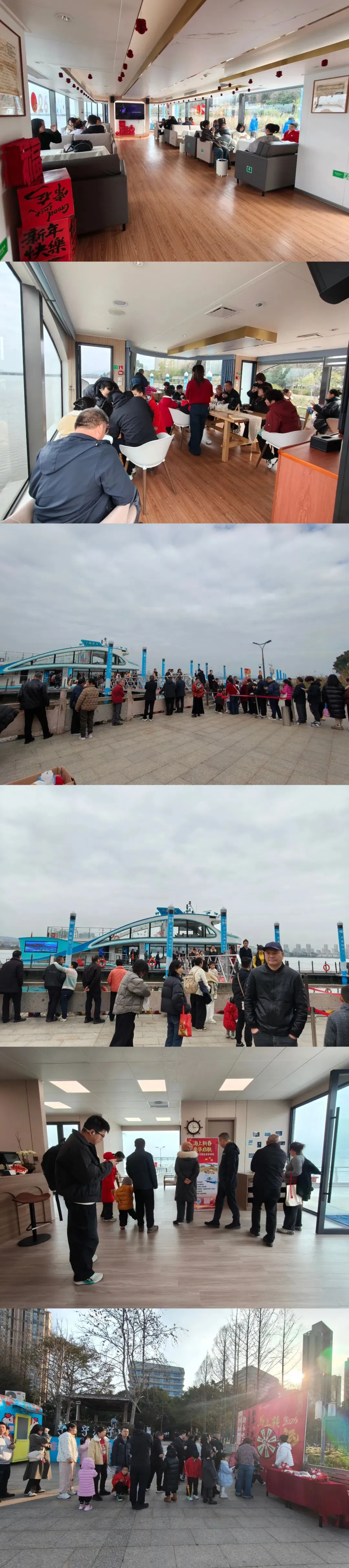 “东湖之星”马年大转盘等互动装置人气爆棚,吸引众多游客驻足互动;船上氛围热烈,男女老少齐聚一堂。