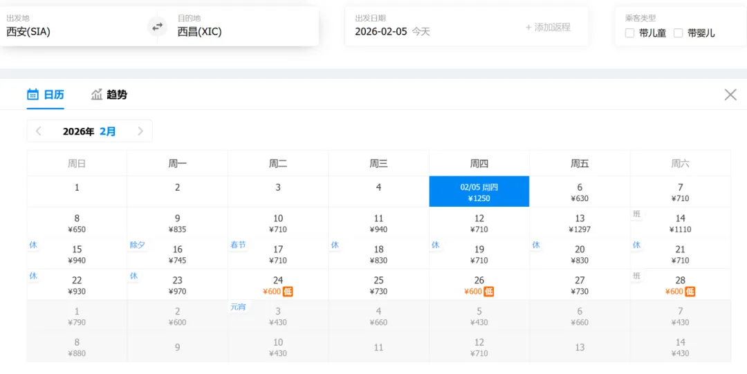 (以下为西安-西昌2月机票截图,价格仅供参考)