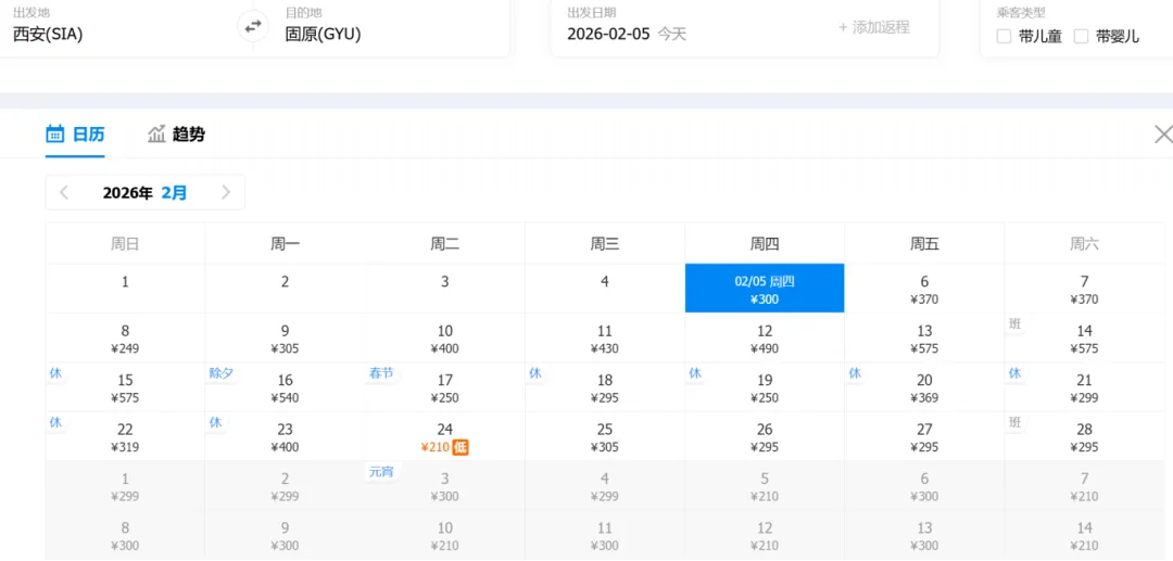 (以下为西安-固原2月机票截图,价格仅供参考)