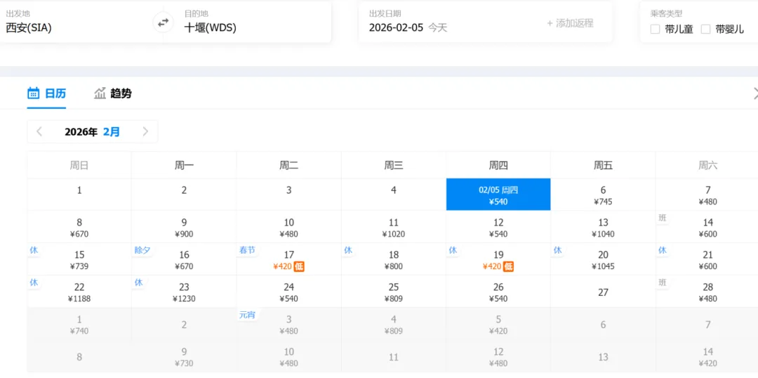 (以下为西安-十堰2月机票截图,价格仅供参考)