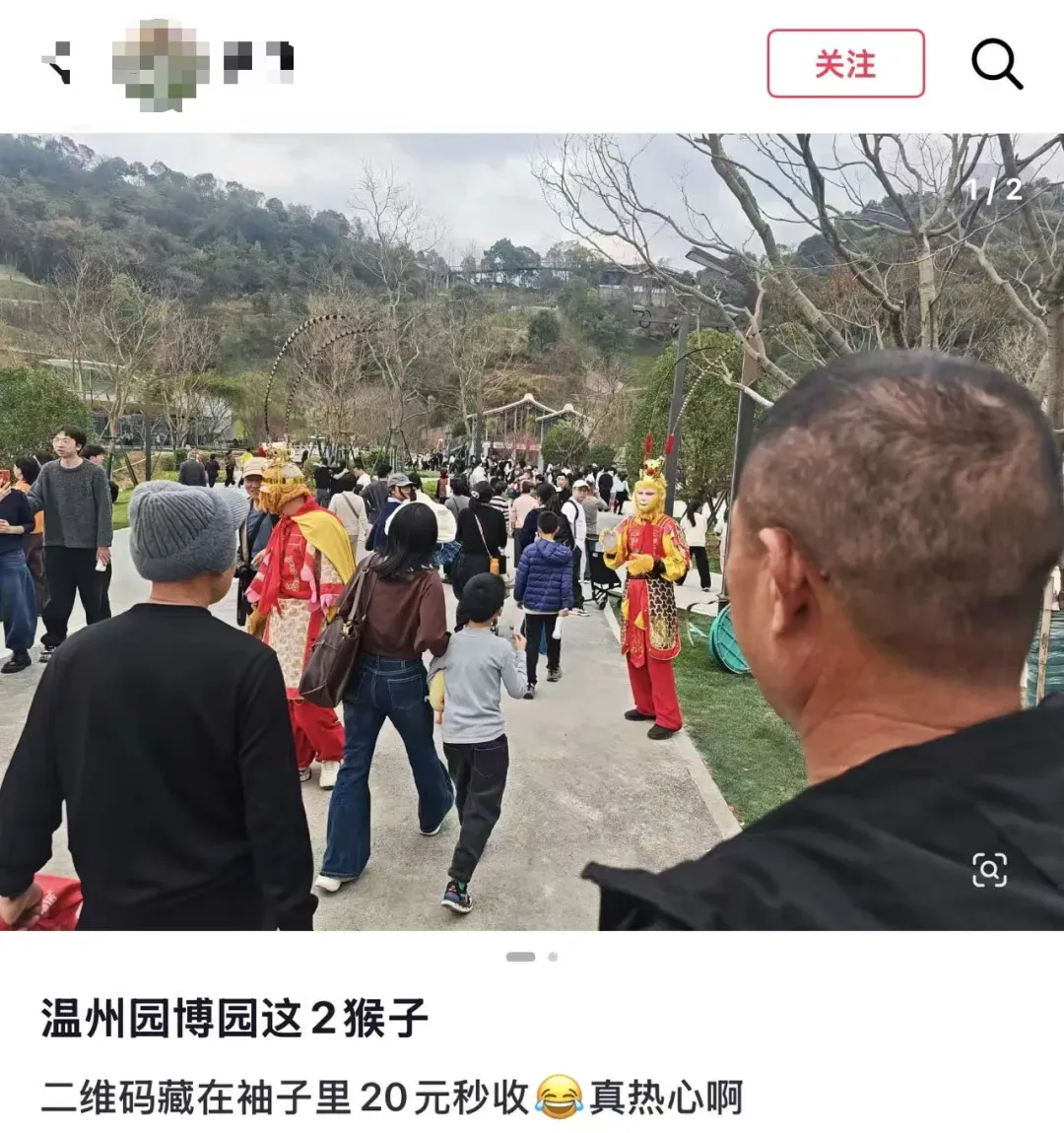然而,在一片热闹之中,也有网友吐槽称,园博园内的两只“猴子”将二维码藏在袖子里,合影后20元秒收,各位家长注意避坑。