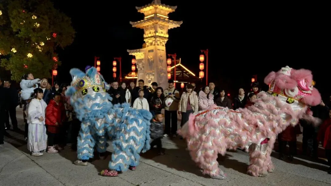 夜幕降临,昭君村景区灯火璀璨。专业非遗表演团队的传统技艺展演准时开演,高温铁水击打成漫天星火,与提火壶绝技相映,舞龙醒狮穿梭其间,现场氛围热烈、年味浓郁。