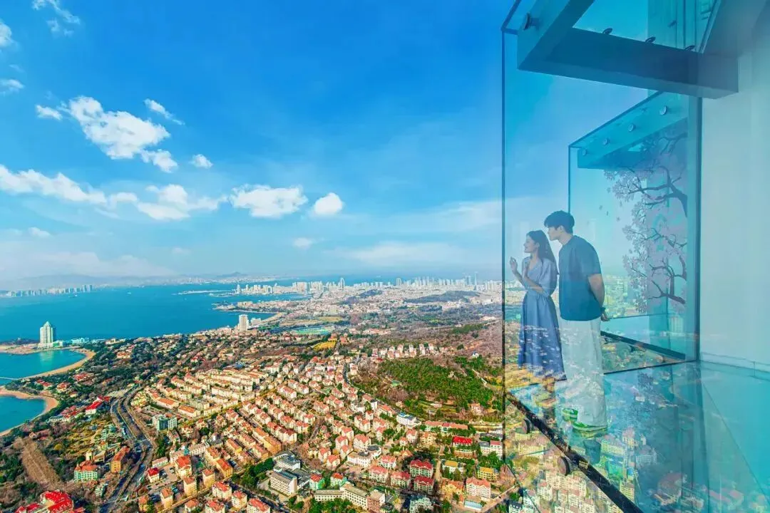 图源:青岛云上海天 登上369米的云上海天81层,站在钻石角全景玻璃观景台上,脚下是潮汐勾勒的城市轮廓,眼前是山海相依的无垠天际,风景美不胜收。