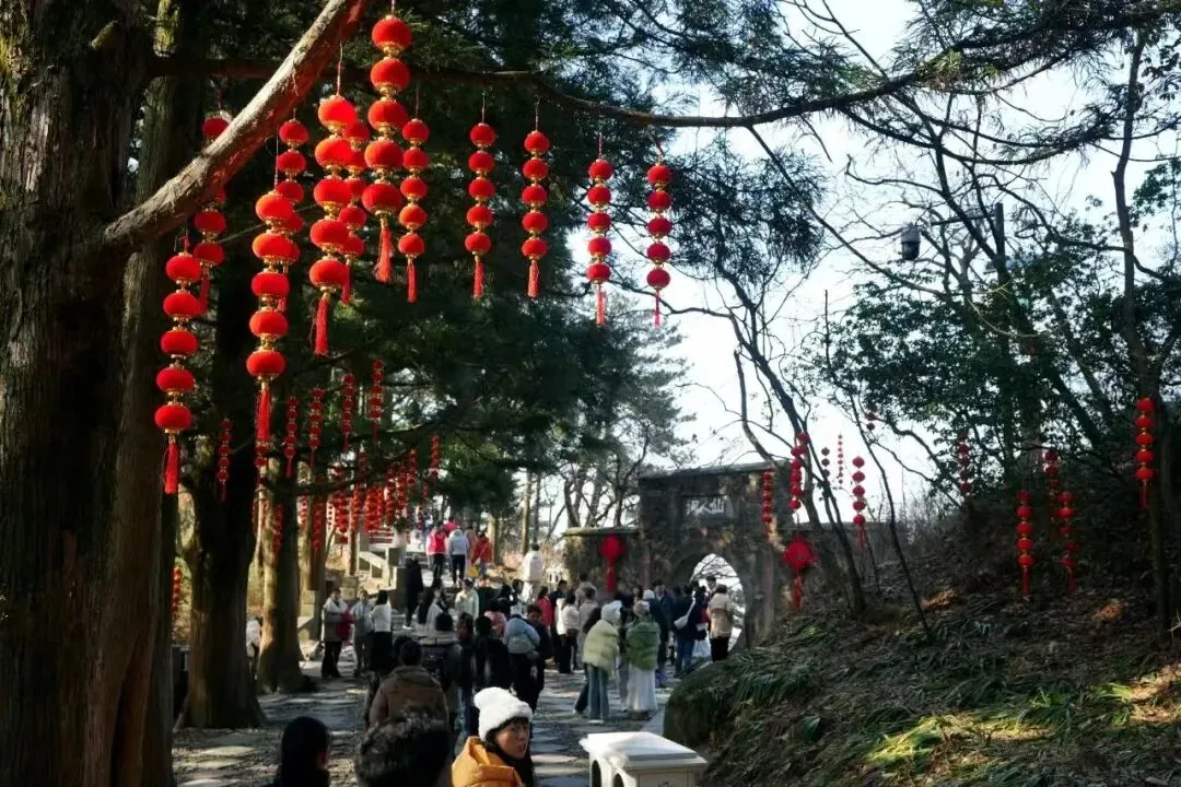 马年春节,庐山景区张灯结彩,处处喜气洋洋。大红灯笼挂满牯岭山城,“拟人”围巾围护着街道梧桐树,树上结满了红彤彤的“硕果”,“全家总动员 庐山过大年”春节主题时而可见。在花径仙人洞景区入口,“2026新年快乐”“马跃福至”“平安喜乐”“福到我家”等新春祝福迎面而来。