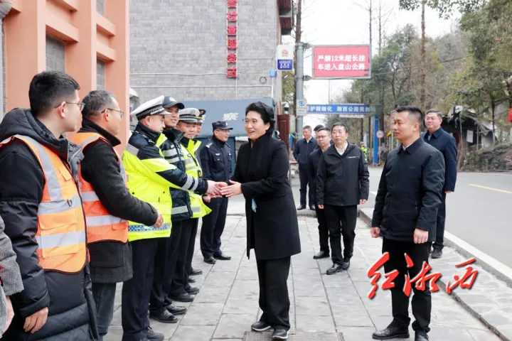 陈华到矮寨景区交警春运执勤点看望慰问一线执勤干警,调研道路交通安全情况。周兴云 摄