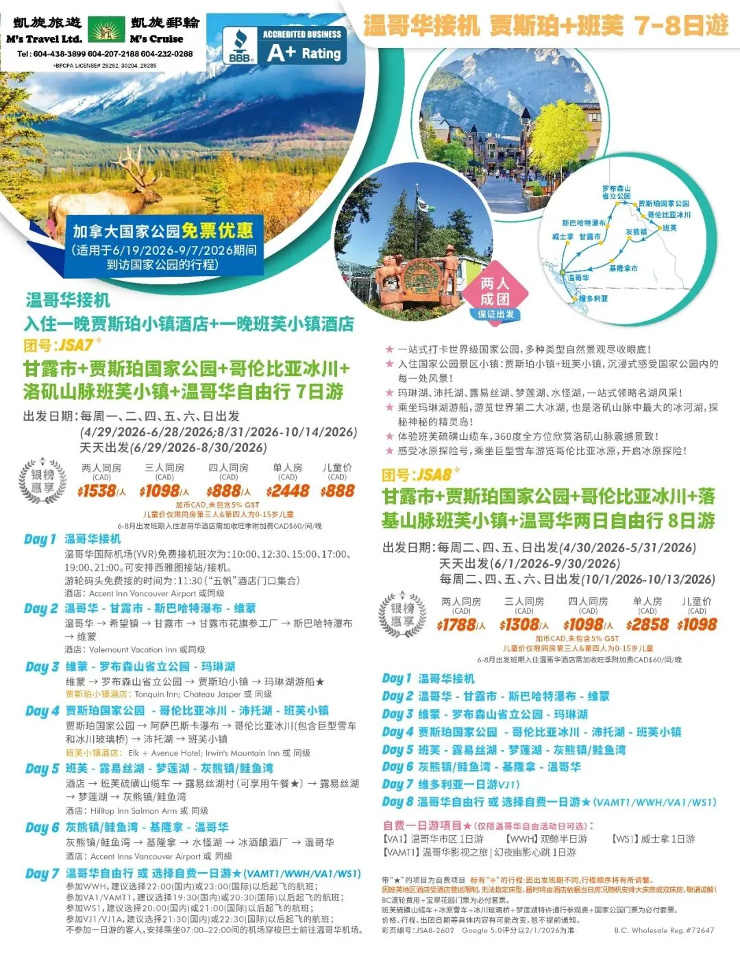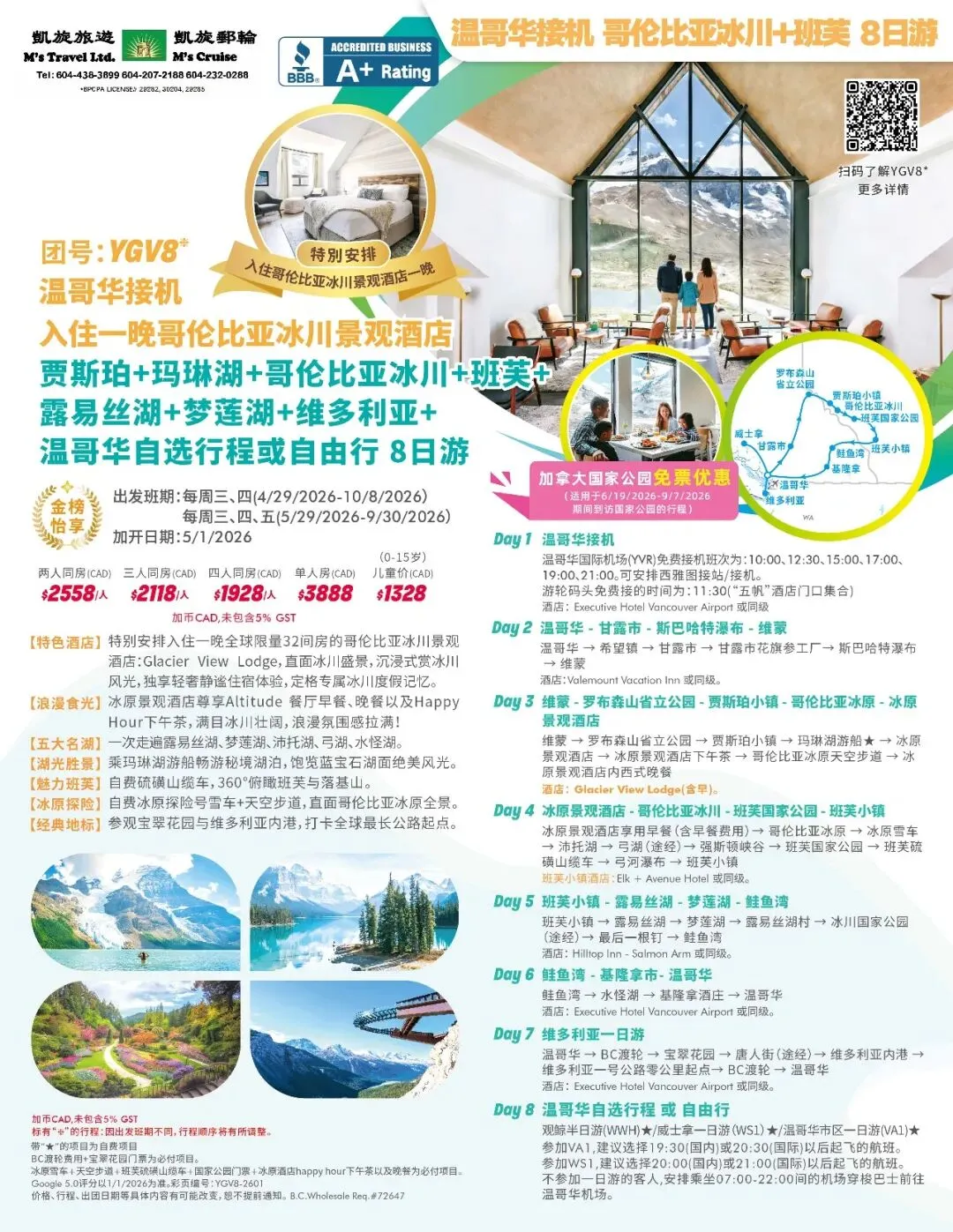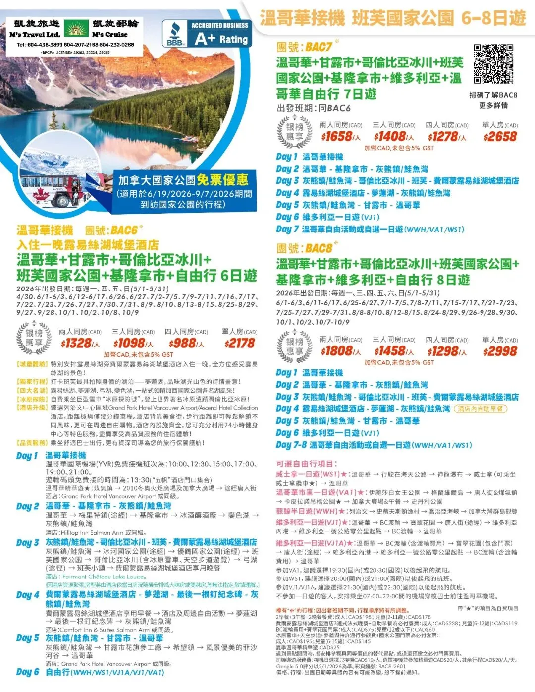 加拿大西海岸旅游|含溫哥華接送機 國家公園/班夫/賈斯珀/冰川國家公園 6~8天團 中文導游帶隊 一站式服務
