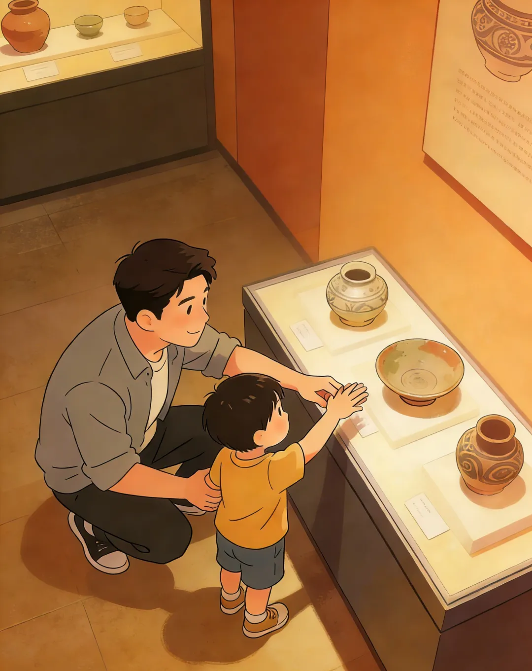 嘉定博物馆洪州窑展览现场,爸爸带娃参观时温柔制止孩子触摸展品的举动,轻声叮嘱:“这是历经千年的文化遗产,轻轻观赏就是最好的守护。”父子俩全程不喧哗、不用闪光灯,用敬畏之心守护文化瑰宝。