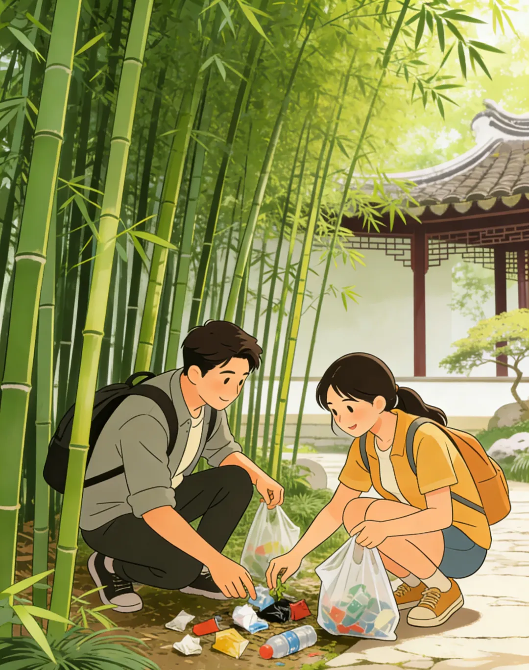 嘉定古猗园内,一群年轻游客结伴赏景,自带垃圾袋,主动捡拾路边、竹丛中的细小垃圾并分类投放,用“人走景净”的行动,留住古猗园的本色之美。