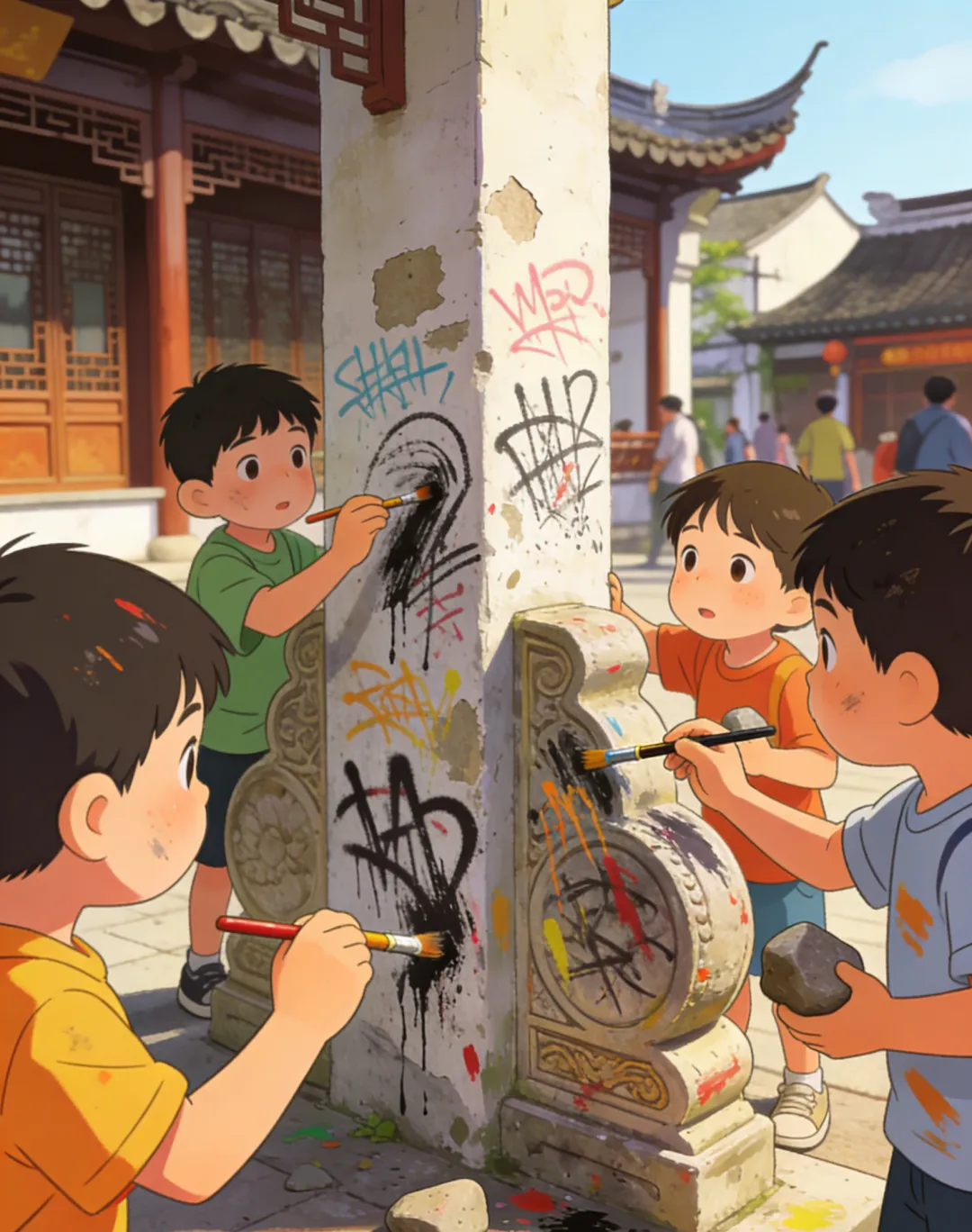 古镇景区内,孩童在无人看管的情况下,随意用画笔、石头等在墙面、古建筑构件上涂鸦,留下杂乱的痕迹。这些涂鸦不仅破坏了景区的古朴风貌,损害了公共环境,也体现出家长监护责任的缺失,与文明旅游、敬畏历史的理念格格不入。