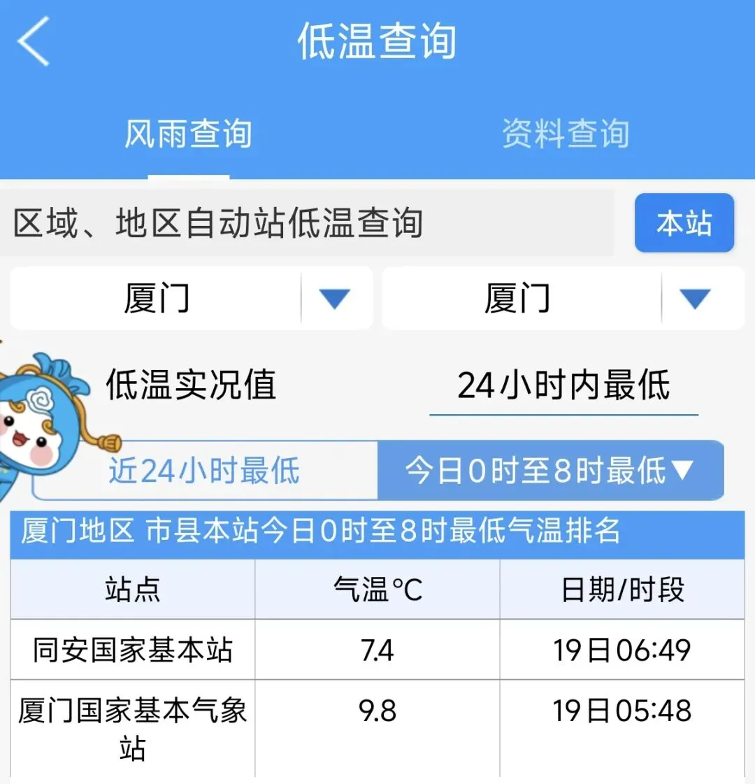 厦门本站最低气温跌到个位数——9.8℃