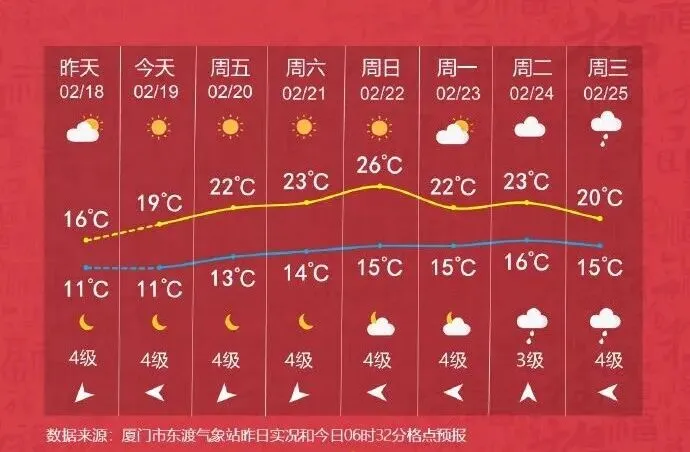 需要提醒的是,眼下已进入春天第二个节气——“雨水”。雨水时节的厦门,平均气温在14℃左右,气温起伏较大,早晚还会觉得冷。冷空气依然活跃,暖湿气流常顺着地面冷空气爬升,造成大范围绵绵细雨,晴雨转换快,乍暖还寒,大家注意春捂。