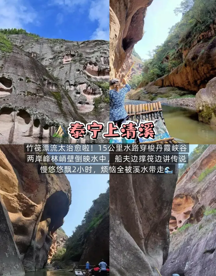 竹筏漂流超治愈!15公里水路穿梭丹霞峡谷,两岸峰林峭壁倒映水中,船夫边撑筏边讲传说,慢悠悠飘2小时,烦恼全被溪水带走,尽享自然之乐~