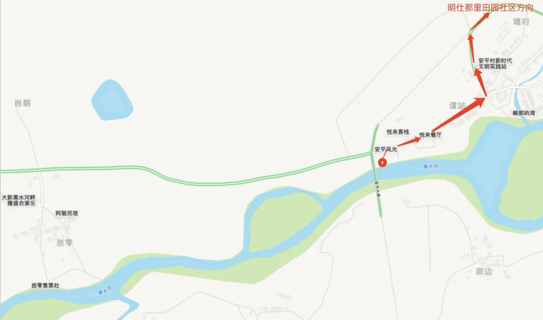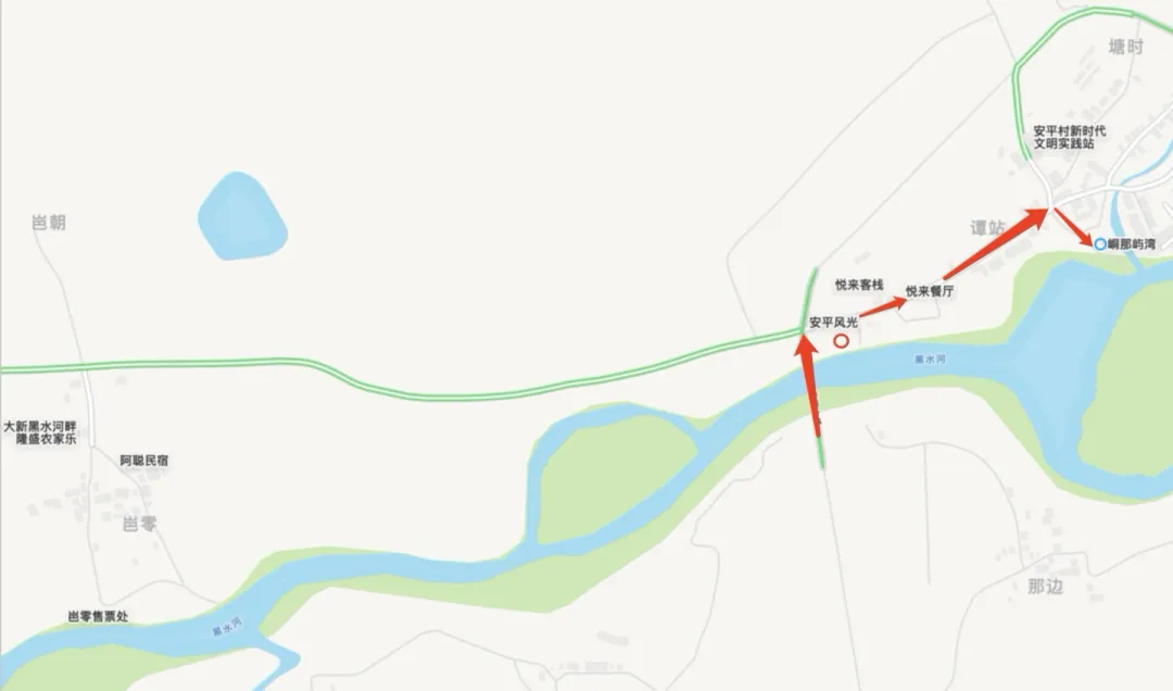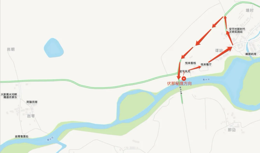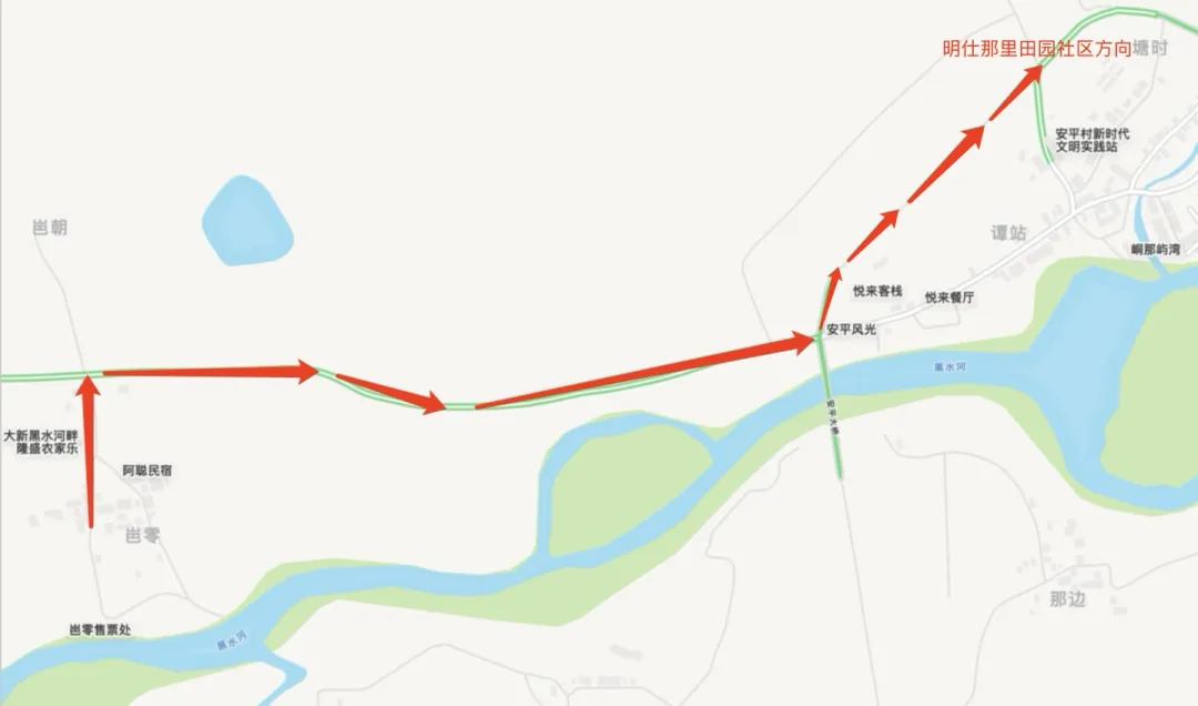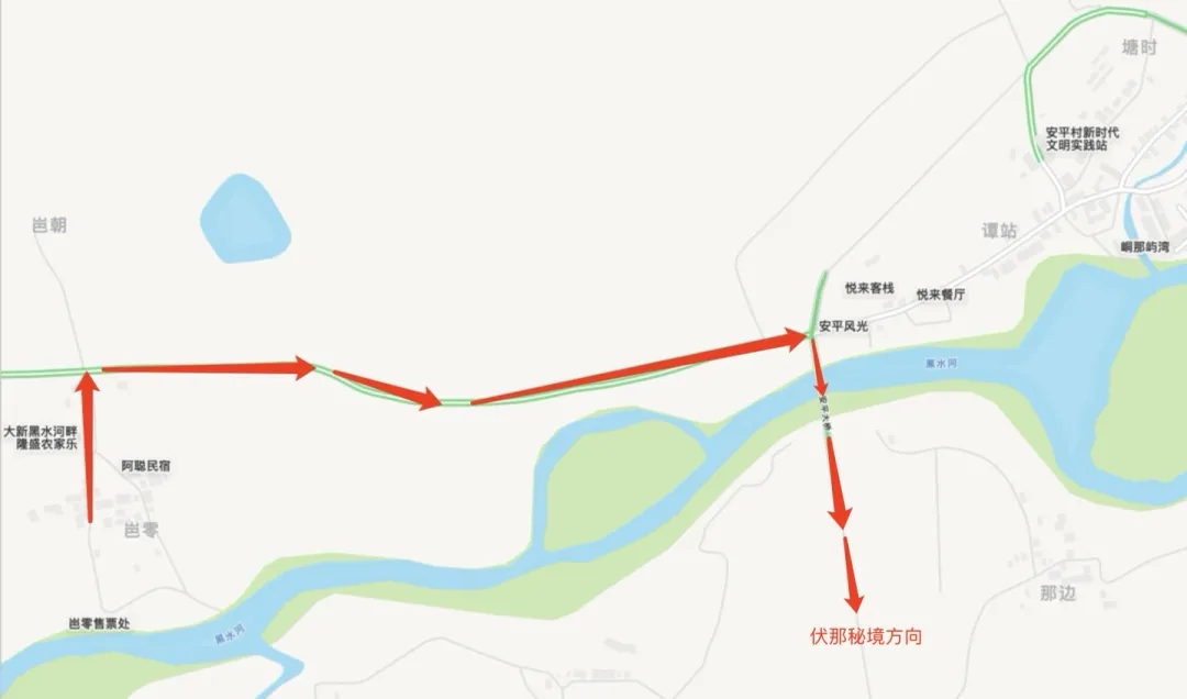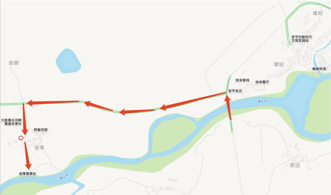 车辆从潭站临时停车场方向驶出后右转,途径景区大门,从安平旧村委处路口驶出进入县道。具体路线为如图: