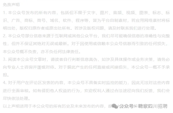 (二)应聘人员需认真阅读本公告,简历一经投递即视为已知晓并认同公告全部内容。报名时所填信息及联系方式(包括手机号、邮箱号等)应准确无误,并保持通讯畅通。若因本人填报内容缺失、有误、漏填或其他原因,导致资格审核不通过、无法进入后续环节或无法取得联系,相应后果均由应聘人员自行承担。招聘过程中,未进入下一环节的应聘人员,不再另行通知。