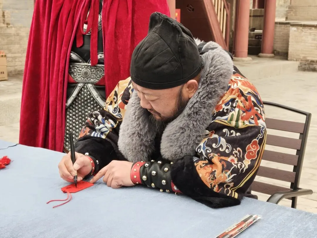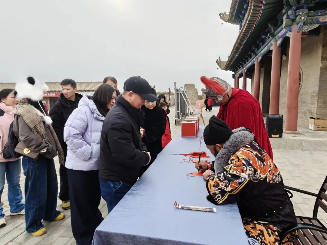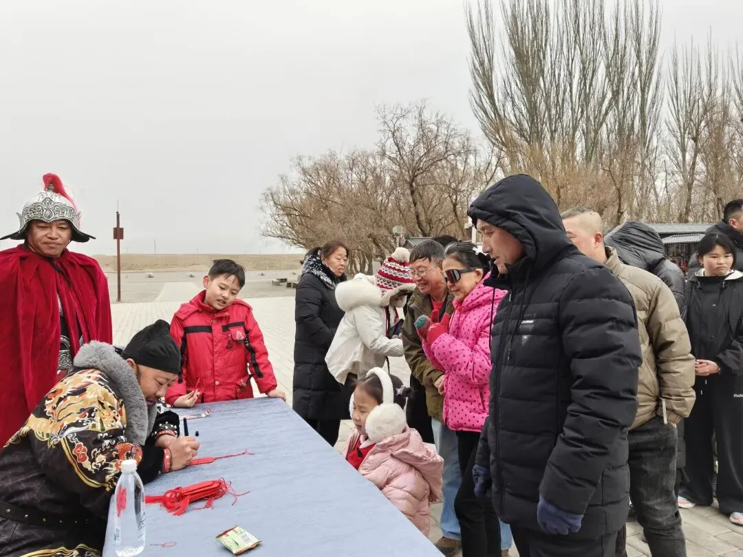 文昌阁前人头攒动,身着铠甲的关长现场挥毫,游客们说出自己的新春心愿,关长一一落笔,在红色挂牌上写下“平安”“顺遂”“高中”“安康”等祝福语,并郑重递到游客手中。接过这份专属定制的新春贺礼,游客们连连道谢,与关长拱手拜年、互道吉祥,雄关脚下暖意融融。