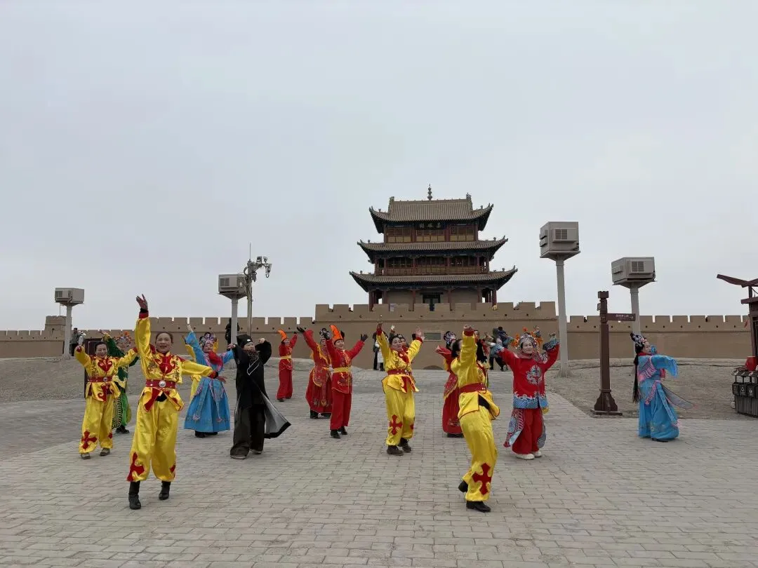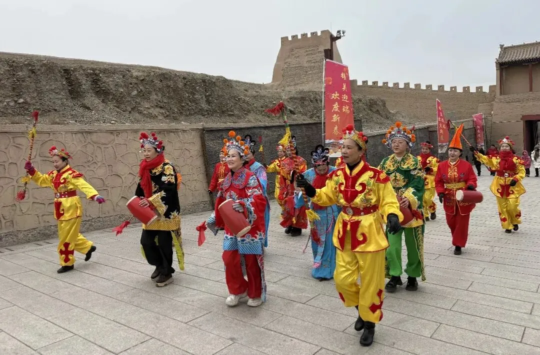 随着一阵欢快的锣鼓声从东闸门响起,一支色彩明艳的秧歌队踏着鼓点鱼贯而入,红绸翻飞、彩扇轻摇,演员们步伐轻快、笑意盈盈,顺着道路舞上城墙。沿途游客纷纷驻足,孩子们跟着队伍小跑,演员们不时回身与观众击掌互道“过年好”。黄土、红绸、秧歌,古老雄关在这一刻焕发出勃勃生机,地道的年俗表演赢得阵阵喝彩。