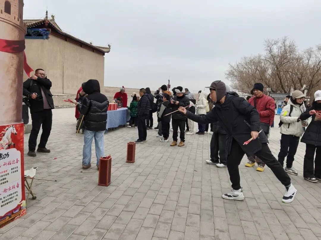 文昌阁一侧,投壶体验点前欢声笑语不断,游客们手持仿古箭矢一试身手,箭矢落壶的脆响引来一阵喝彩。旁边的玄机箱前,有人摸出猜对,喜滋滋领走明信片;有人猜不出来,急得跺脚直笑。内城各处,孩子们寻觅到藏于内城各处的“幸运小马”挂件,文昌阁前,祈福墙上密密匝匝的新春寄语写满对未来的美好期许。