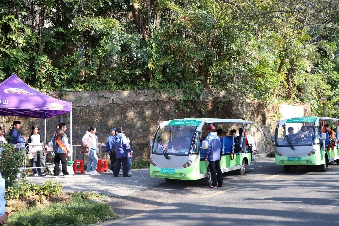 众多游客也乘坐行运观光车,