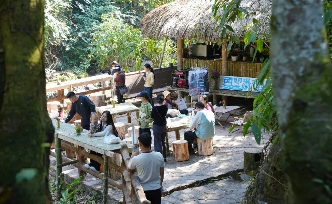 与龙潭的静谧不同,勐梭里坎景区(里坎瀑布)则以奔放的热情迎接着八方来客。还未走近,便能听见轰鸣的水声。沿着景区步道深入,原始森林遮天蔽日,空气中弥漫着清新的负氧离子。瀑布栈道下人潮涌动,飞泻而下的水流激起阵阵水雾,引得游客纷纷打卡拍照,定格这壮美的瞬间。