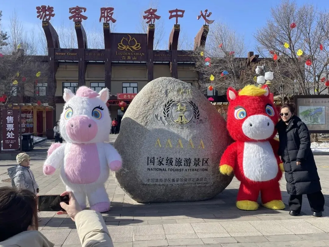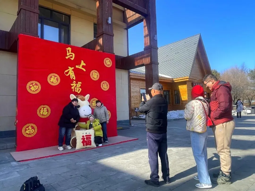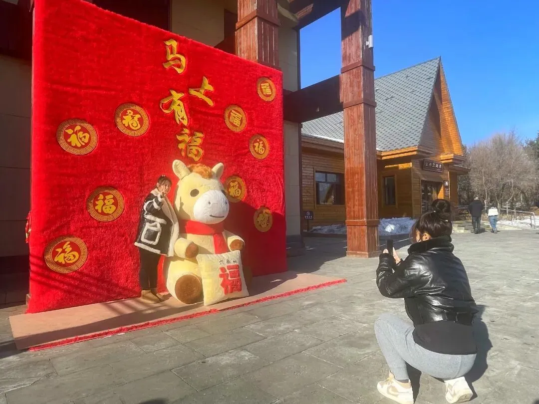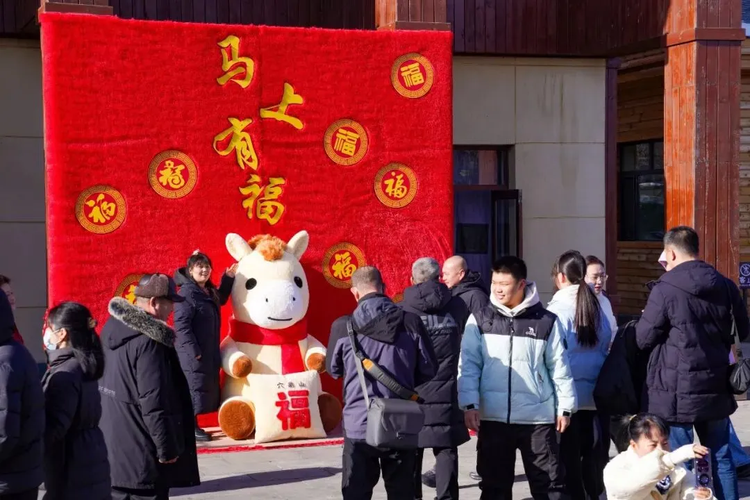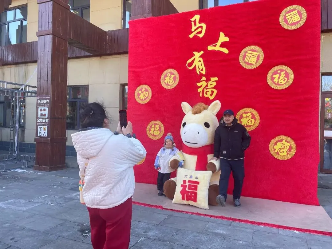 游客服务中心门前,马上有福互动打卡点人气最盛,成为游客入园后的“必打卡地”。景区员工还化身萌趣小马NPC,身着喜庆演出服饰,热情地与游客挥手、互动、送祝福,一句句“马上有福”的美好寄语,瞬间拉满新春氛围。现场排起长长的打卡队伍,孩童牵着家长的手与小马并肩比耶,年轻人挽着亲友解锁创意pose,更多家庭全家总动员,身着新衣依偎在小马身旁,笑容明媚、暖意融融,定格张张满含福运的新春全家福,随手分享至社交平台,传递来六鼎山的新春喜悦。
