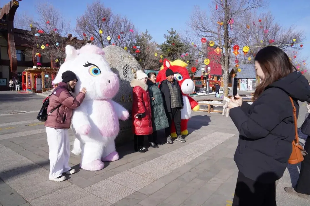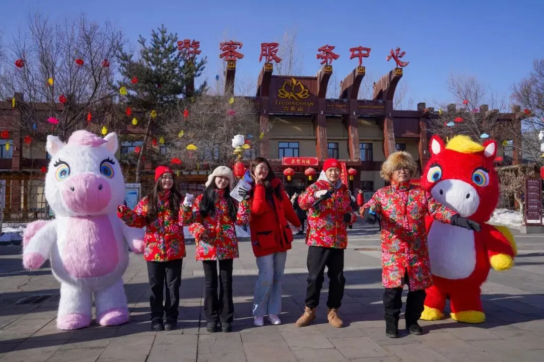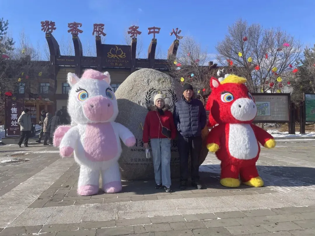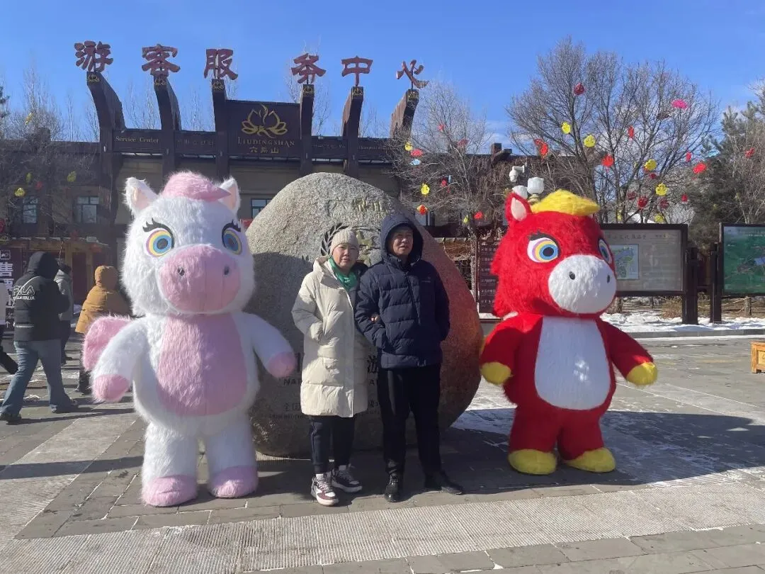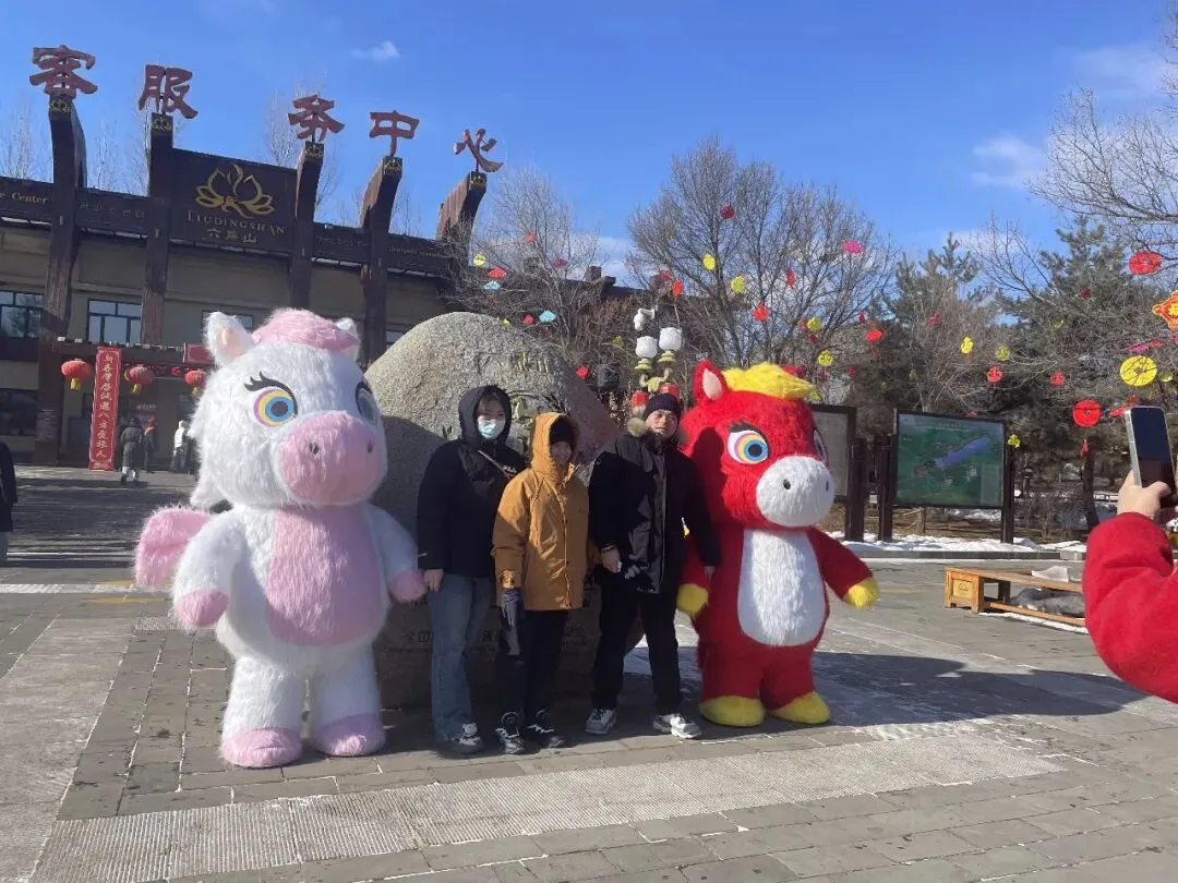 游客服务中心门前,马上有福互动打卡点人气最盛,成为游客入园后的“必打卡地”。景区员工还化身萌趣小马NPC,身着喜庆演出服饰,热情地与游客挥手、互动、送祝福,一句句“马上有福”的美好寄语,瞬间拉满新春氛围。现场排起长长的打卡队伍,孩童牵着家长的手与小马并肩比耶,年轻人挽着亲友解锁创意pose,更多家庭全家总动员,身着新衣依偎在小马身旁,笑容明媚、暖意融融,定格张张满含福运的新春全家福,随手分享至社交平台,传递来六鼎山的新春喜悦。
