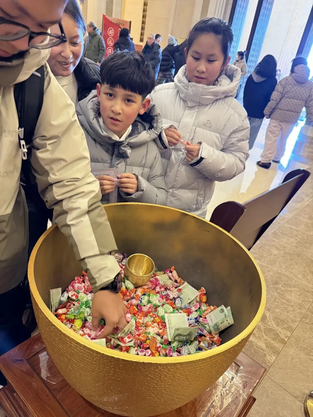 艺术馆内的聚宝盆纳福打卡点,暖意与喜气交织,成为游客纳福的热门之选。硕大的聚宝盆内,金元宝道具、香甜糖果错落摆放,氛围感十足。游客们纷纷驻足打卡,与聚宝盆同框留念,记录这份新春福泽,分享打卡照片至朋友圈后,还能领取盆中好物,在趣味互动中收获满满福气。
