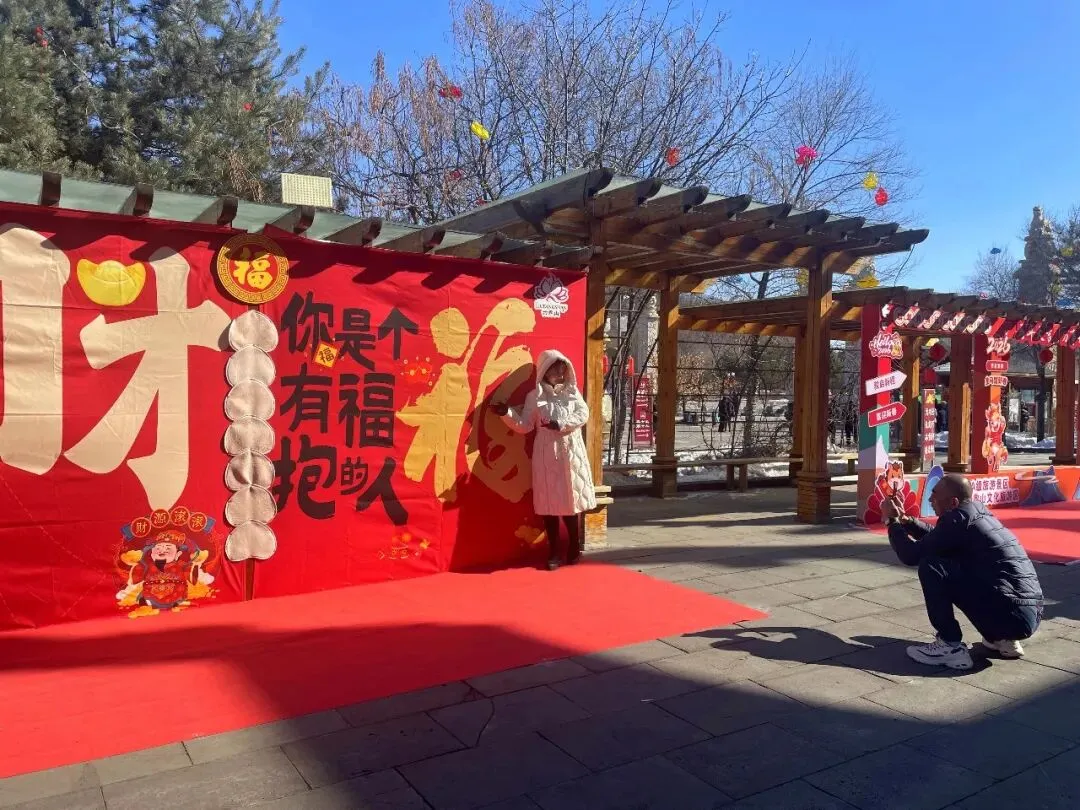 游客服务中心前长廊的“福财双全”主题打卡墙,凭借独特创意成为网红打卡热点,人气持续攀升。打卡墙融合传统书法的厚重与现代艺术的灵动,成为游客传递心意的绝佳背景。