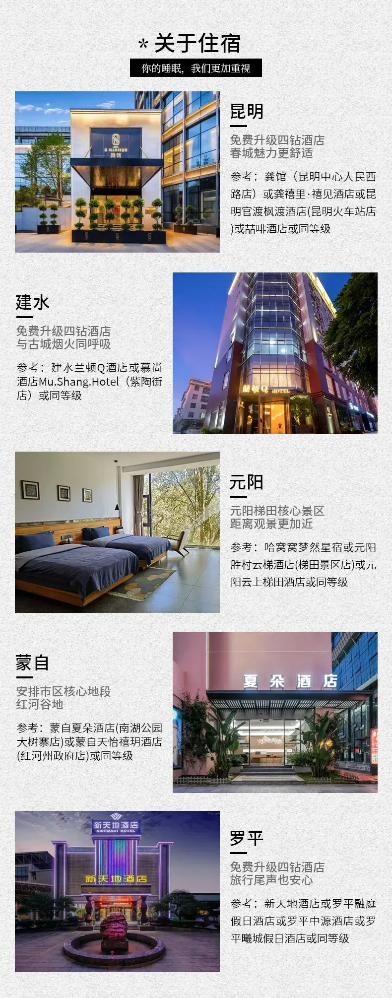 1、住宿:昆明1晚四钻酒店(参考:龚禧里禧见酒店或昆明官渡枫渡酒店(昆明火车站店)或龚馆酒店或同等级),罗平1晚四钻酒店(参考:新天地酒店或罗平融庭假日酒店或罗平中源酒店或罗平曦城假日酒店或同等级),建水1晚四钻酒店(参考:建水兰顿Q酒店或慕尚酒店Mu.Shang.Hotel(紫陶街店)或同等级),元阳1晚三钻酒店/民宿(参考:哈窝窝梦然星宿或元阳胜村云梯酒店(梯田景区店)或元阳云上梯田酒店或同等级),蒙自1晚三钻酒店(参考:蒙自夏朵酒店(南湖公园大树寨店)或蒙自天怡禧玥酒店(红河州政府店)或同等级);