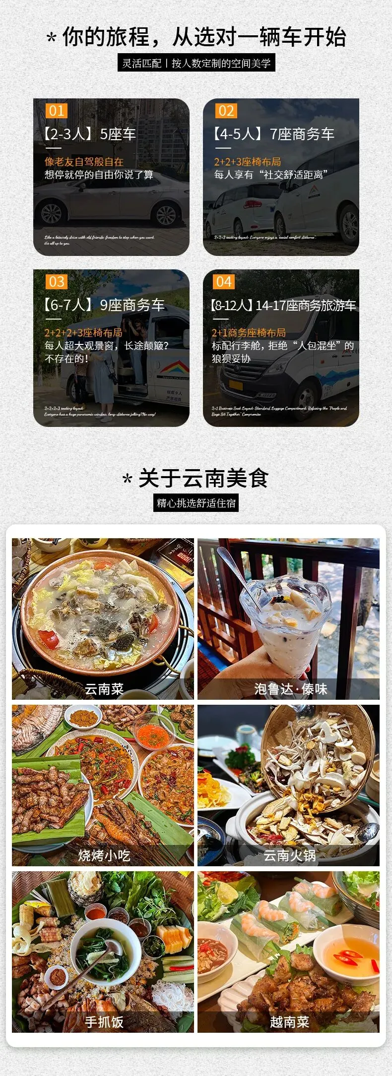 3、用车:2-3人安排5座车,4-5人安排7座商务车,6-7人安排9座商务车,8-12人安排14-17座旅游车 ;