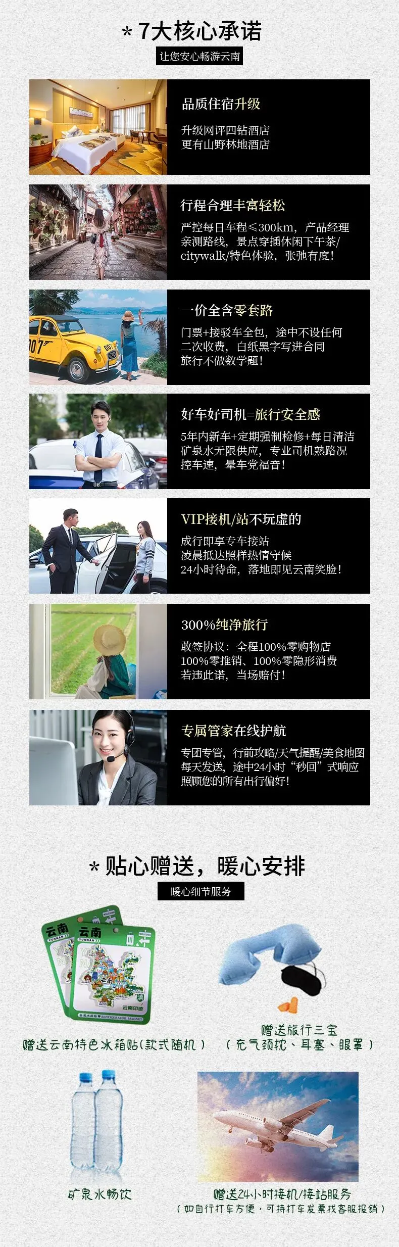 7、本产品行程实际出行中,在不减少景点且征得客人同意的前提下,领队、司机可能会根据天气、交通等情况,对您的行程进行适当调整(如调整景点游览顺序等),以确保行程顺利进行。