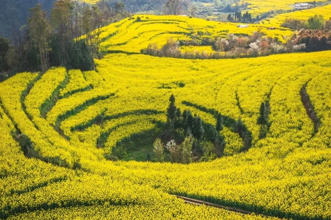 10:00 前往【螺丝田油菜花】。牛街“螺丝田”是由串珠岩溶漏地质地貌构成的自然景观,漏斗如此密集,形态如此奇特,目前尚不多见。这里的梯田是圈状的,远远看去像是螺丝上的旋纹。沿着梯田一圈圈往上延伸的油菜花,像无数金龙盘卧。