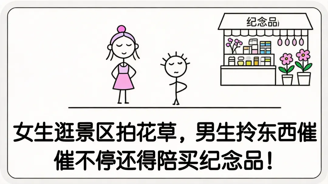 看女生慢逛景点,男生催促陪伴;