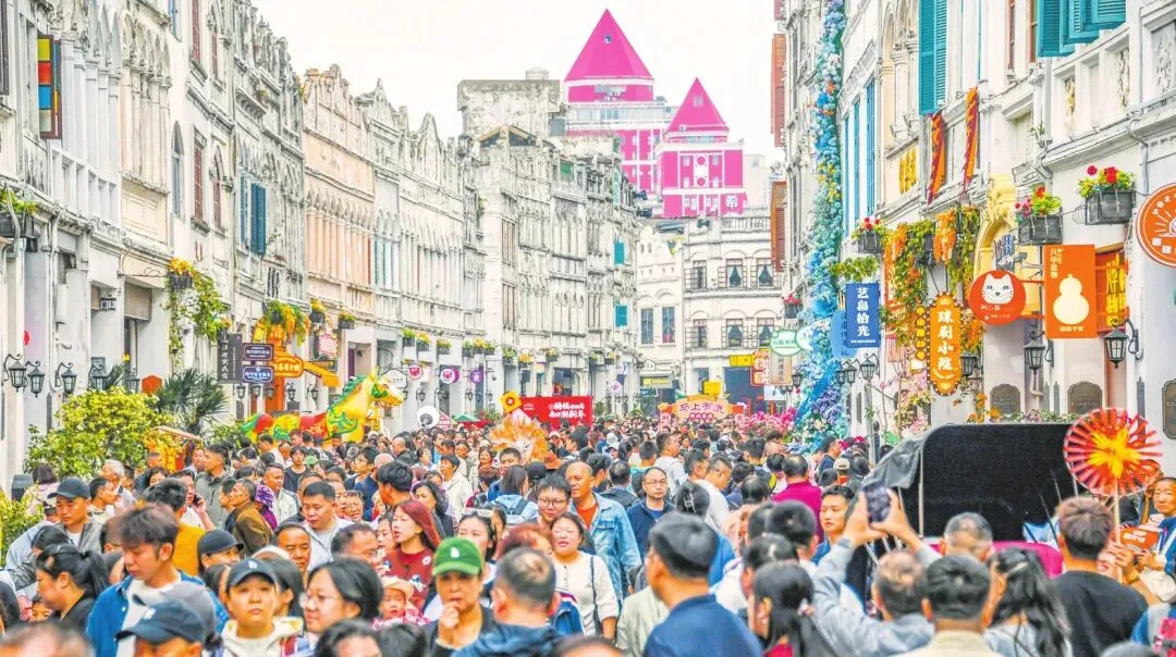 与此同时,在观澜湖华谊冯小刚电影公社,“电影公社里的中国年”主题活动火热进行。三大街区化身沉浸式演艺场,每天超40场演出轮番上演,身着民国服饰的演员们沿街巡游,与游客互动合影;非遗市集上,椰雕、黎锦等手工艺品琳琅满目。