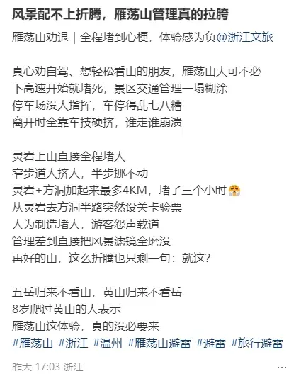 不少游客纷纷吐槽,此番雁荡山之行满心期待而来,却遭遇诸多糟心状况,甚至有人直呼想要退票,整体游玩体验感拉满负值。