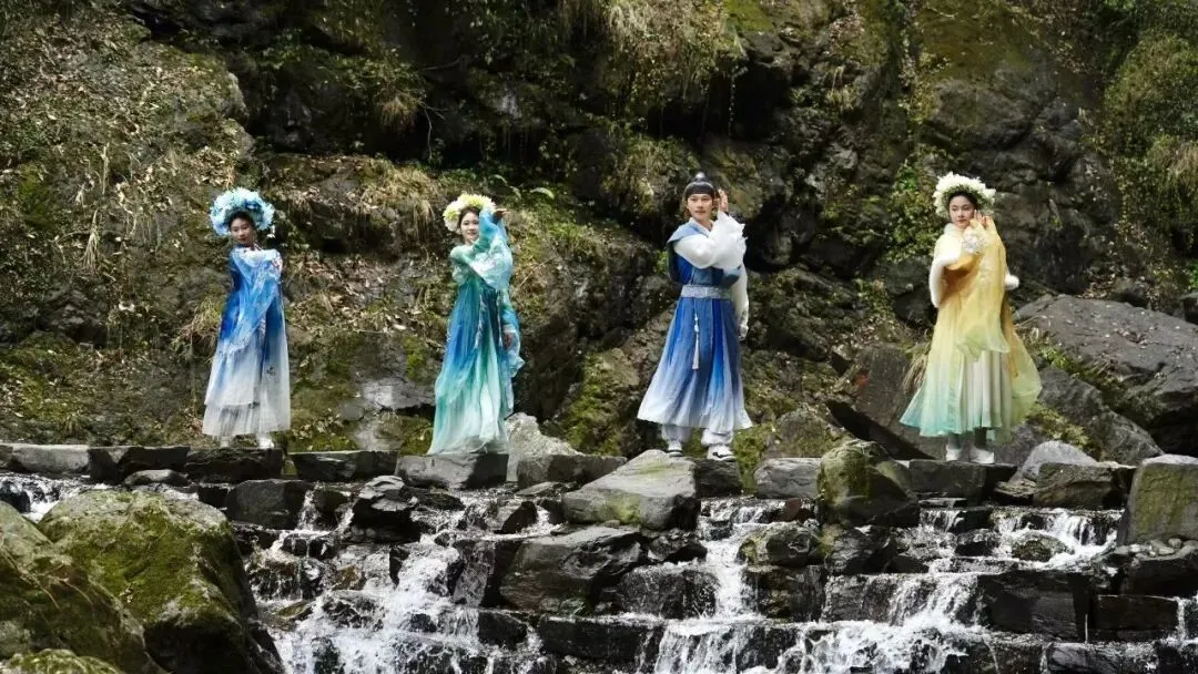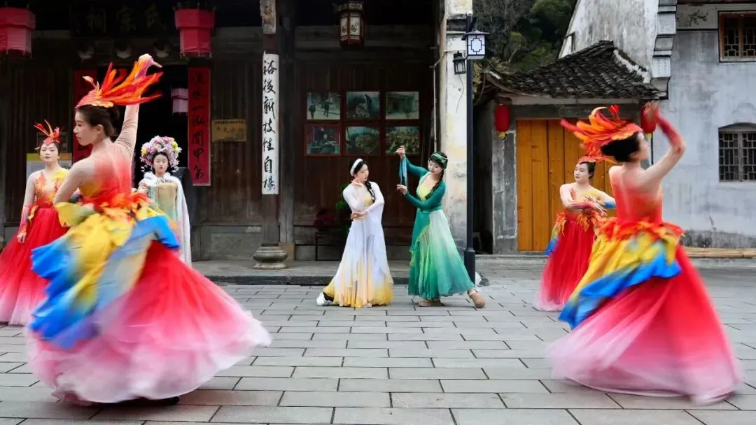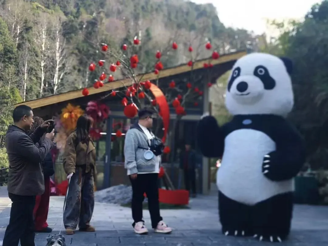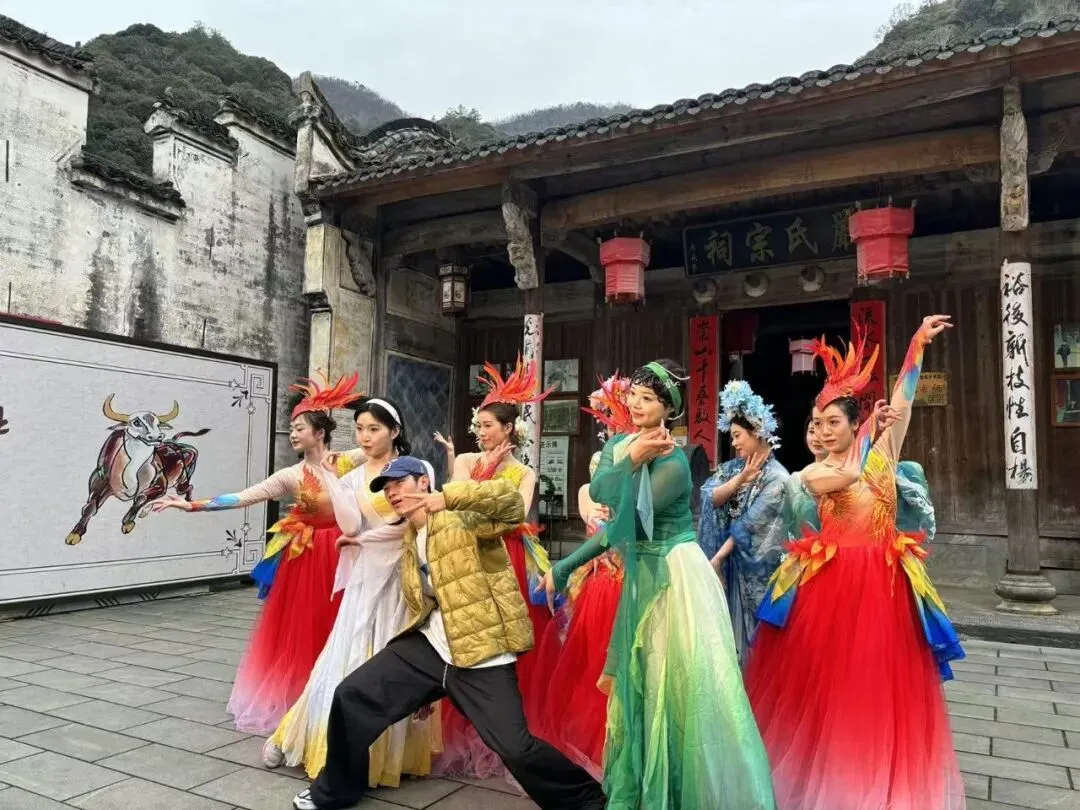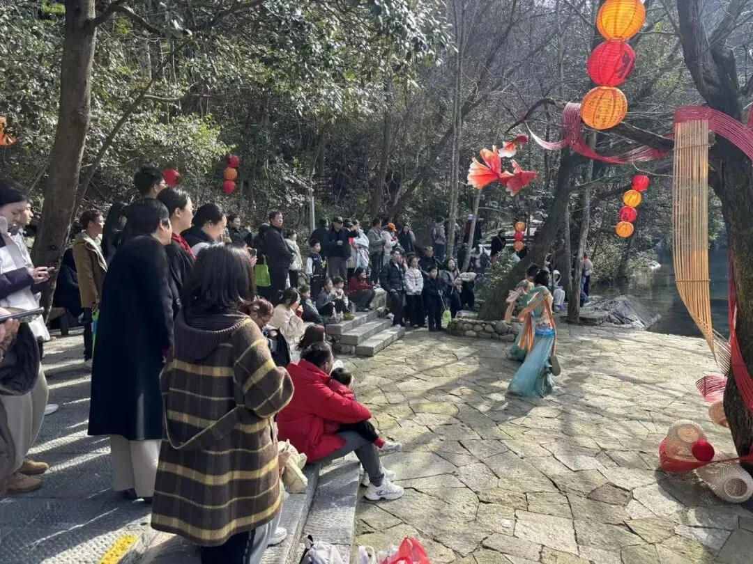 为了让游客有更强的参与感和体验感,景区还创新推出了牯牛巡游、憨趣熊猫、霓裳惊鸿等互动演出活动,分时段分别在严家古村、四叠瀑布等热门景点与游客进行趣味互动,为游客派发新春祝福。游客们既可以驻足观看,也可以加入巡游队伍载歌载舞,这种沉浸式的体验让游客真正从“看客”变成了年俗活动的“主角”。