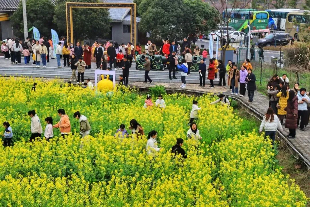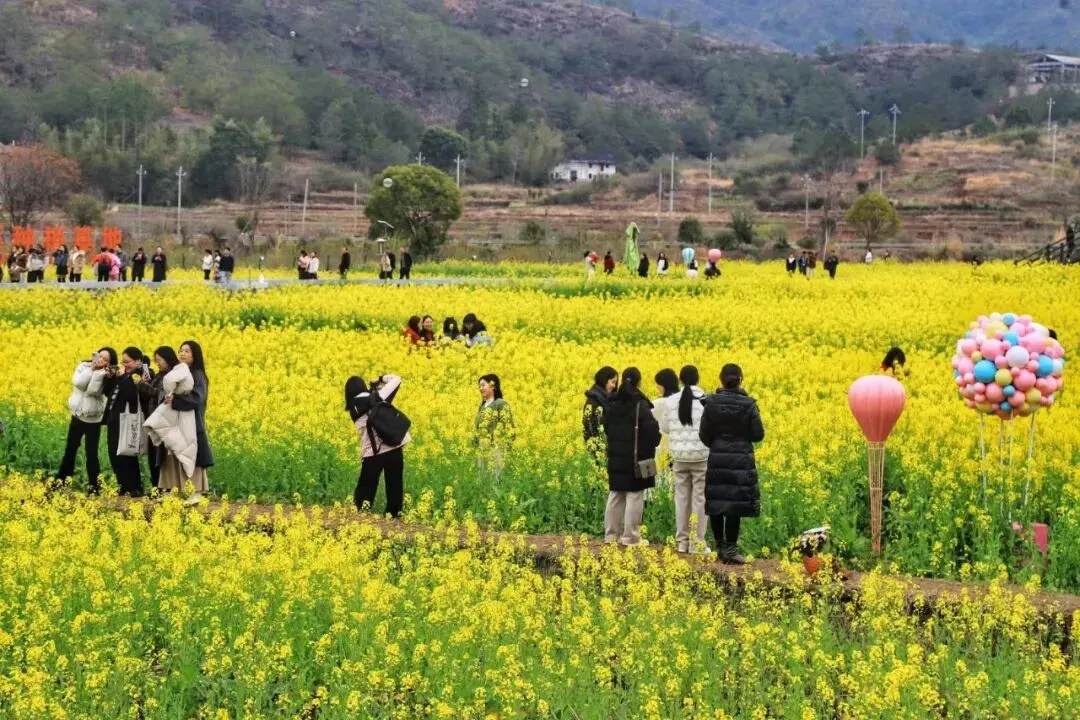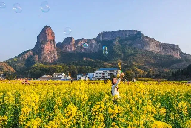 除了热闹的春节活动,景区的自然风光同样令人陶醉。通天寨下的百亩油菜花竞相绽放,金黄的花海与远处丹霞地貌的山峦交相辉映,构成一幅绝美的春日画卷。游客们纷纷踏入花田小径,拍照打卡,记录下这早春的限定美景。