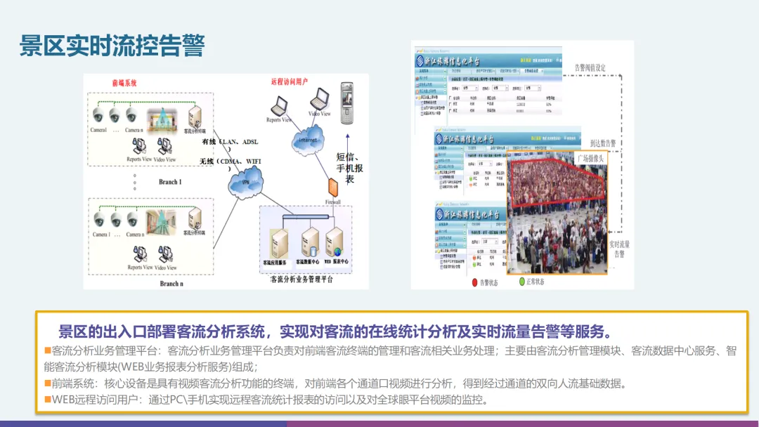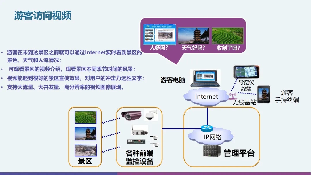 本方案面向旅游业从传统服务业向现代服务业转型升级的关键窗口期,以“主动感知、完美体验、智能服务”为核心价值导向,系统构建覆盖旅游前、旅游中、旅游后全周期的智慧旅游一体化解决方案。方案立足我国旅游业信息化基础薄弱、信息资源零散、共享性差、更新滞后等现实痛点,充分把握全球智慧旅游发展同台竞争的战略机遇,以云计算、物联网、移动互联网、位置服务、视频感知等技术为支撑,打造集旅游云数据中心、综合管理平台、公共服务平台于一体的智慧旅游总体架构,推动旅游管理与服务向精准化、实时化、智能化跃升。 在服务游客层面,方案以移动端导览客户端与定制终端为载体,提供定位导航、自助播报、周边设施搜索、最佳线路规划、轨迹记录等全功能自助导览服务,实现“走到哪儿、讲到哪儿”的智能化讲解体验。通过LBS定位与电子门票二维码技术融合,支持短信、WEB多渠道票务预订与线下快速验证,打通线上预定与线下入园闭环。基于实时视频接入与高清图像传输,游客可在出行前远程浏览景区实况、天气与人流,辅助行程决策,提升出游预期体验。 在景区管理层面,方案部署客流视频分析终端与管理平台,实现出入口双向人流统计、流量实时监测、超限自动告警,支撑景区高峰疏导与应急调度。平安景区监控系统实现全景区视频覆盖、手机端移动巡查、历史录像回溯与远程对讲,构筑立体化安防体系。停车场管理子系统通过车牌识别、车位感应、诱导屏指引与短信预约,实现从入口到泊位的全程无感引导,显著提升车辆周转效率与游客满意度。 在产业赋能层面,方案构建旅游电子商务基础平台,整合旅游线路、酒店、租车、土特产等预订服务,融合支付与客户关系管理,拓展景区、酒店、商家的线上营销通路。通过“小区短信”企业名片、同行业信息交互平台、多媒体查询终端等载体,实现区域性、精准化促销信息投放与跨商家联动,激活旅游消费增量。 方案面向政府管理部门提供旅游信息资源管理、客流态势分析、行业监督评估与应急指挥调度等决策支撑工具,形成覆盖“资源汇聚—态势感知—协同调度—公众服务”的智慧旅游闭环体系,为目的地构建差异化竞争优势、培育现代旅游服务新业态提供系统化解决方案。