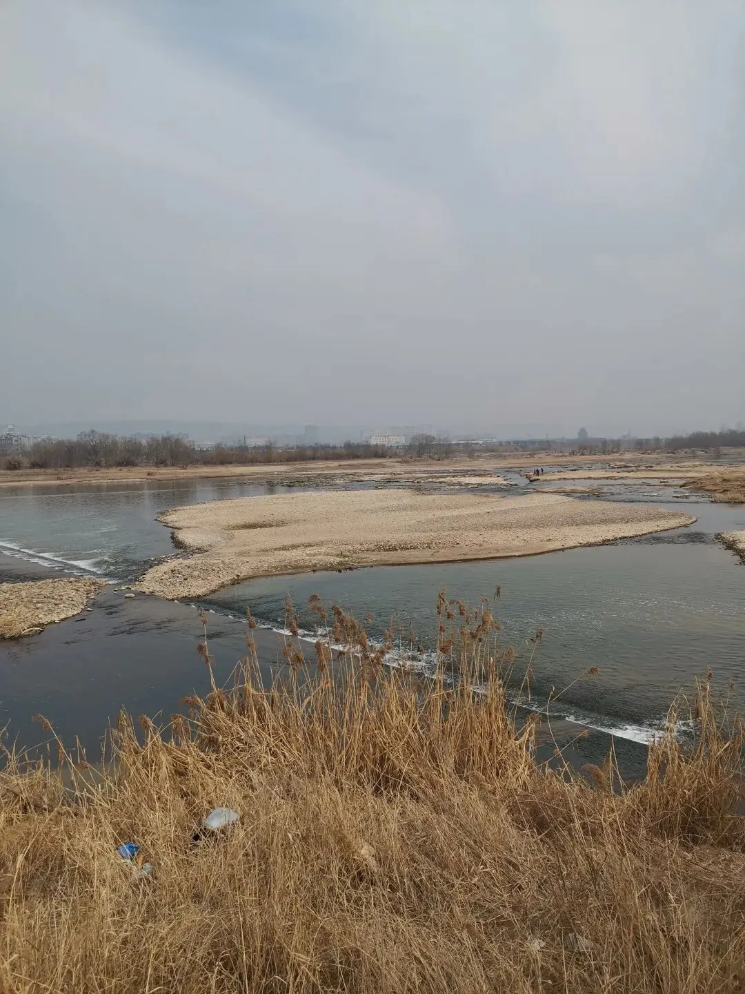 可惜我们来的不是时候。冬日万物沉寂,草木凋零,景色难免萧索。眼前大片枯黄的芦苇在风中轻摇,河床裸露着灰白的沙石,处处是干涸的洼地与零星的水泊。可孩子们不在乎这些。他们弯腰捡拾圆润的鹅卵石,蹲在水边寻找游鱼的踪迹,笑声像铃铛般洒满滩涂。