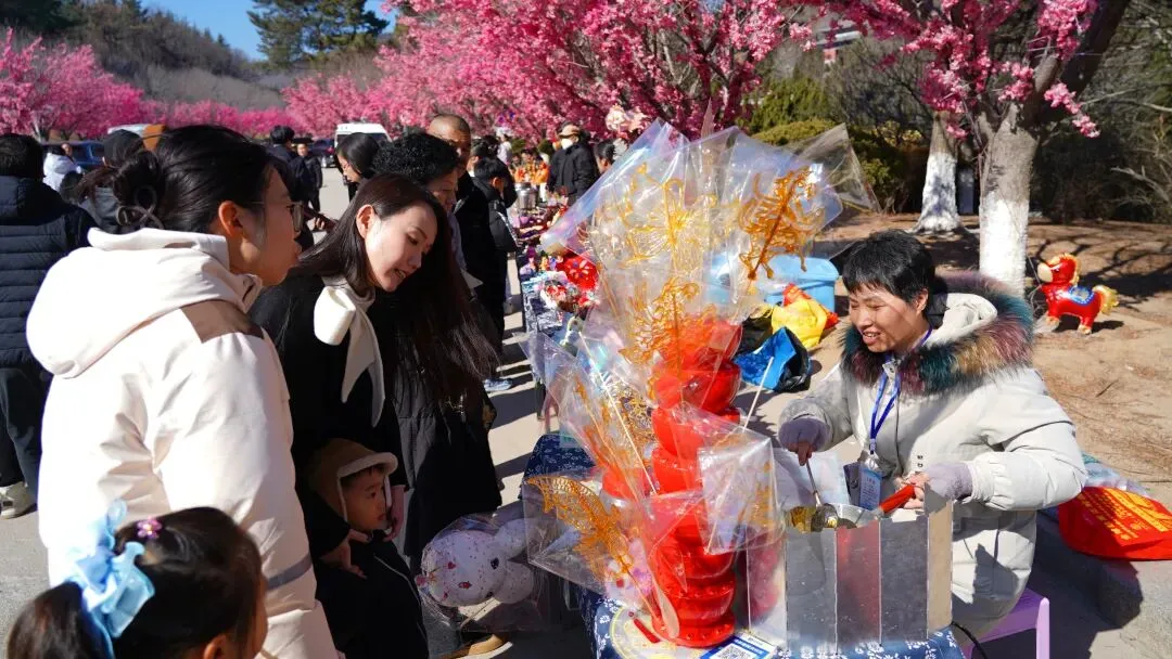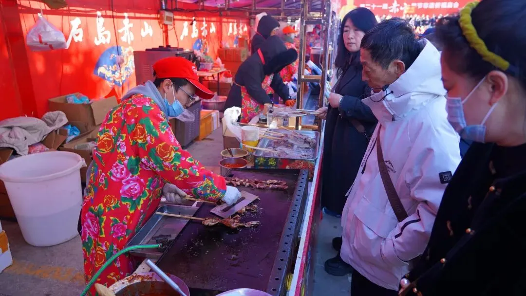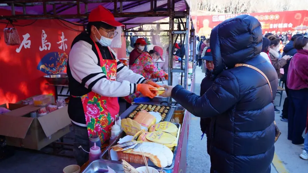 庙会上的非遗大集上汇聚了荣成当地的诸多好物。与非遗大集相邻的特色美食街区,则汇集了武汉热干面、老赤山小面、铁板鱿鱼等地道胶东小吃,让游客在游览之余,也能品尝到“舌尖上的年味”。