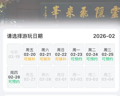 灵隐飞来峰景区预约小程序显示,2月19日至22日已进入候补状态,2月23日至26日仍有预约名额。