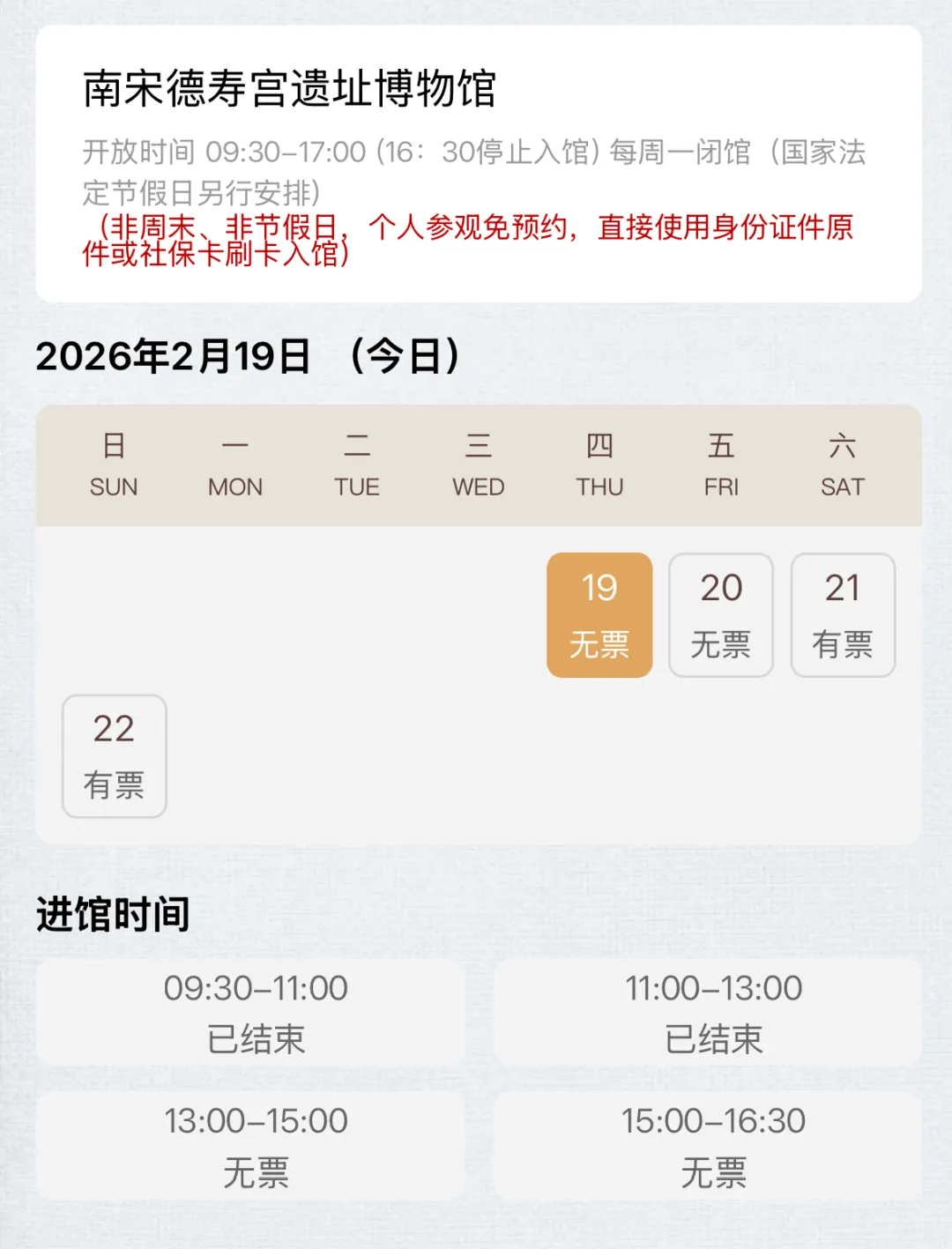 2月19日至20日,南宋德寿宫遗址博物馆预约已满,21日至22日仍有票。
