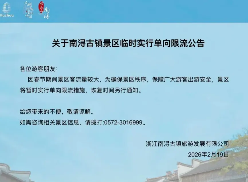 湖州南浔古镇景区19日发文提醒,景区将暂行单向限流。上虞覆卮山景区发文称,景区停车场已经饱和,建议游客调整出行计划。