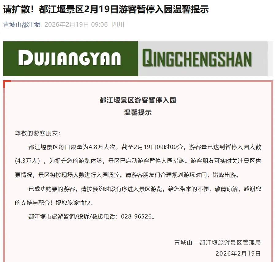 此外,全国多地景区也是客流爆满。四川都江堰景区、峨眉山景区、九寨沟景区,河南龙门石窟景区、老君山、洛阳古墓博物馆等多个景区发布提示,提醒游客当日预约已满,建议错峰参观。