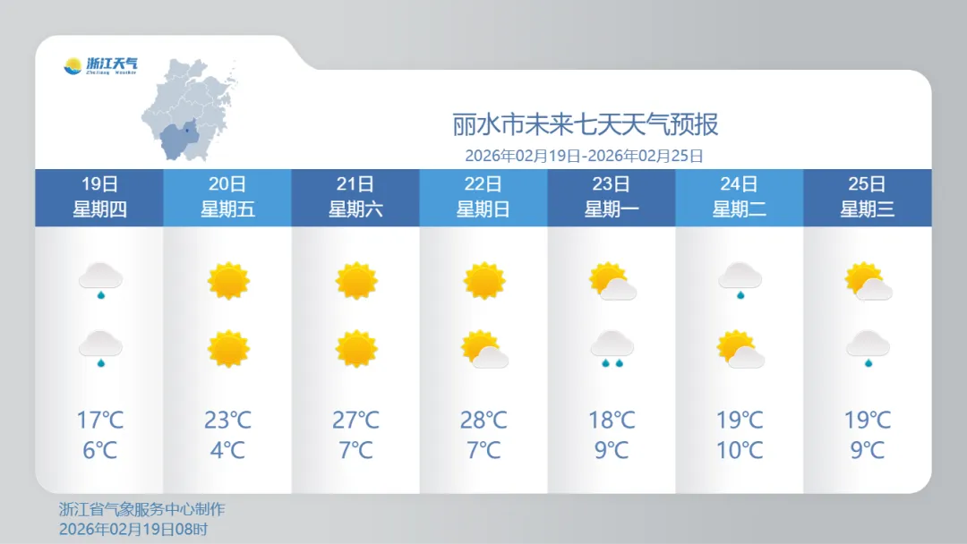 不过这样暖持续不了几日。2月21日(正月初五),新一股冷空气来袭。对浙江而言,23日(正月初七)开始,浙江将迎来多阴雨天气的转折,23—24日受冷空气影响,全省有一次降水降温过程。
