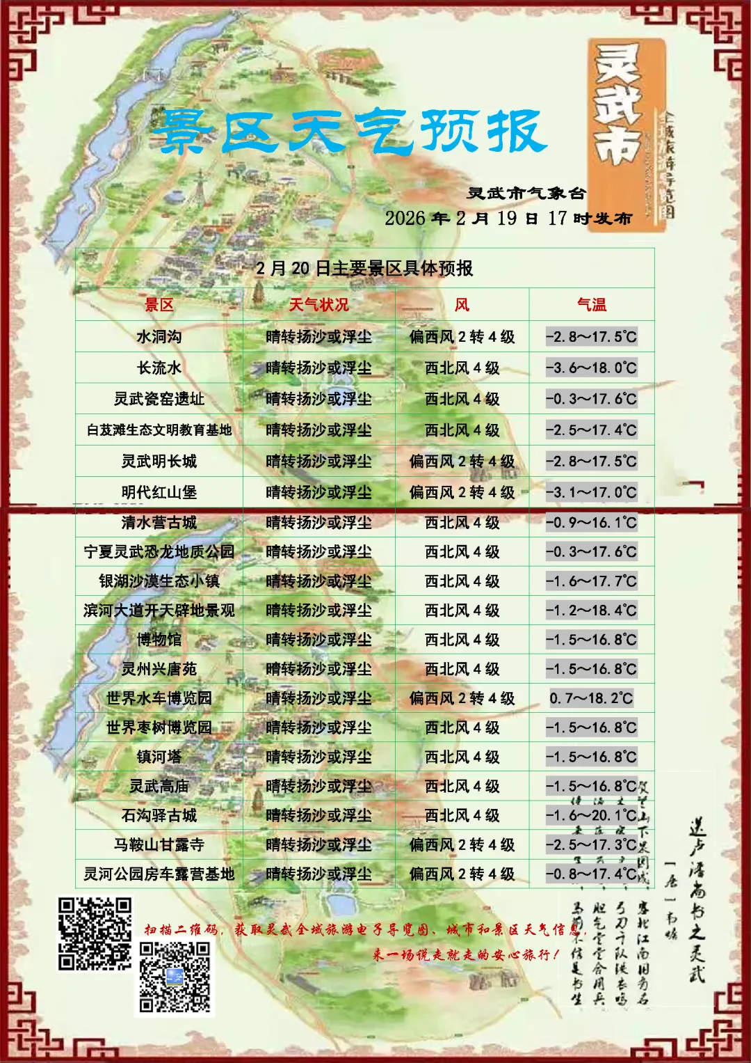 您现在的位置是:首页 > 国内旅游目的推荐 > 正文 国内旅游目的推荐 2月20日 | 灵武市景区预报 admin2026年02月19日 17:40:43国内旅游目的推荐11 2月20日 | 灵武市景区预报 转载请说明来源于"旅荐网",部分内容转载自网络,如有侵权请联系qlwl@foxmail.com删除 本文地址:https://www.15386.cn/post/114613.html 上一篇 河南旅游省钱攻略,4天3晚人均800+,导游带你玩遍精华景点 下一篇 天国轶事 对蒙山县太平天国景点开发的论述 相关文章 【案例】西双版纳佛居山生态文化旅游区总体规划 —— 立足农林发展,助力乡村振兴 报告解读 | 《2026年全球旅游业发展趋势报告》 短途旅行险|平安境内短途计划,适合自驾游、公司团建、户外活动及高风险运动 #北京旅游攻略 谁说旅行必须做攻略?在长春街头随意Citywalk,才是打开春天的正确方式 【旅游安全】文化和旅游部《旅游安全实务手册》系列十︱旅游自救知识(三) 到瓷一游,景德镇三天两晚旅游攻略 拆开黄河边的未知惊喜(二)延黄公路旅游攻略 广东汕头旅行攻略+实用TIPS 黑洞旅行指南9-蒸发(二)-3.25三 发表评论 取消回复 评论列表 这篇文章还没有收到评论,赶紧来抢沙发吧~