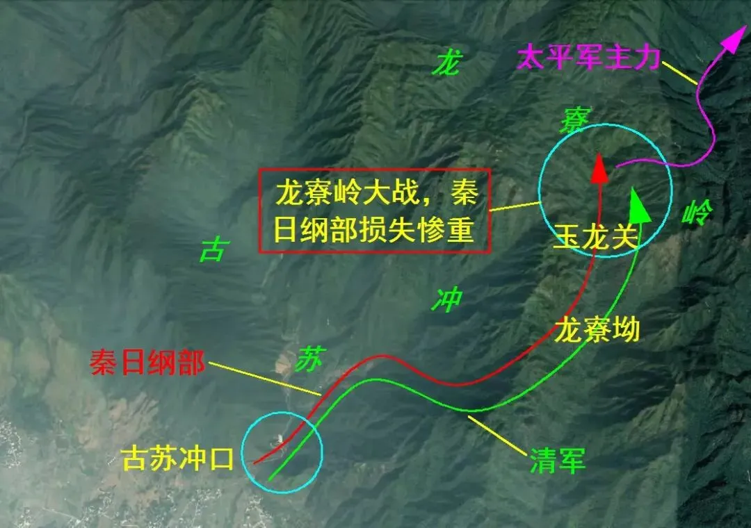 ①玉龙关破封锁。1852年4月4日晚,罗大纲率领太平军2000人先锋队于三更前就赶到古苏冲口的富豪村,以迅雷不及掩耳之势,冲破敌人三道封锁线,跟着使用“冲腰剪尾”战术,抄袭玉龙关的侧背,直捣清军指挥中心寿春大营。隐蔽在冲口的太平军此时似猛虎下山,即时推毁了敌人的营寨、炮台、栅卡、壕堑二十多处。五更,罗大纲又率领先锋队冲上龙察岭顶,保障了太平天国军民顺利突围。