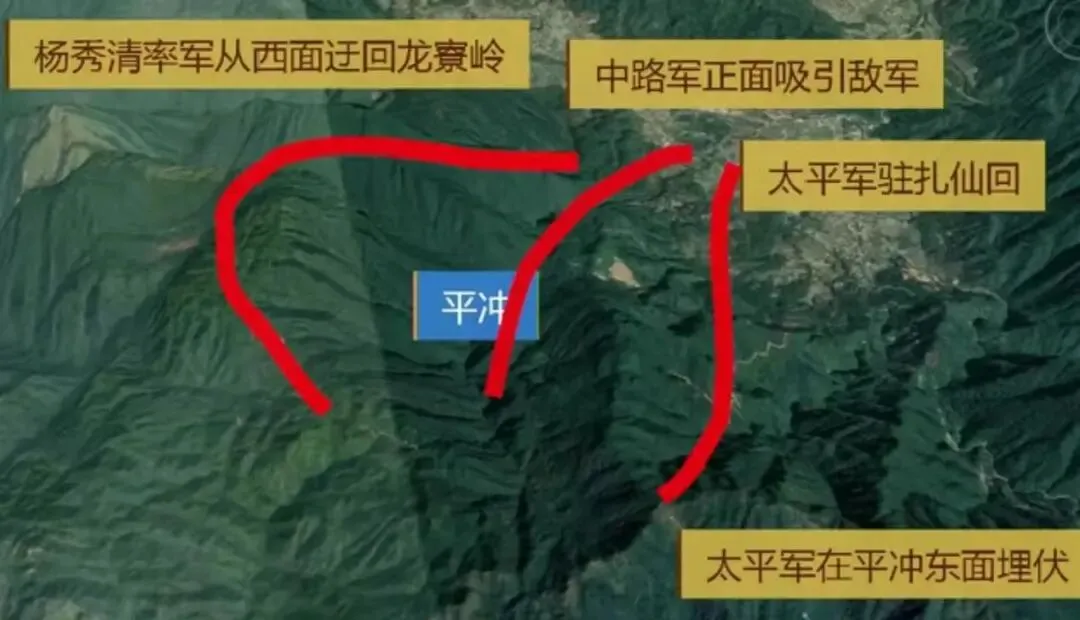 ③三冲围歼战。为报此仇,4月7日晚,洪秀全、杨秀清、石达开、罗大纲等带领太平军分为三路人马,抢占平冲、旱冲、崩冲、黄草岭、大厄等地的山头,布成一个长袋形阵地。