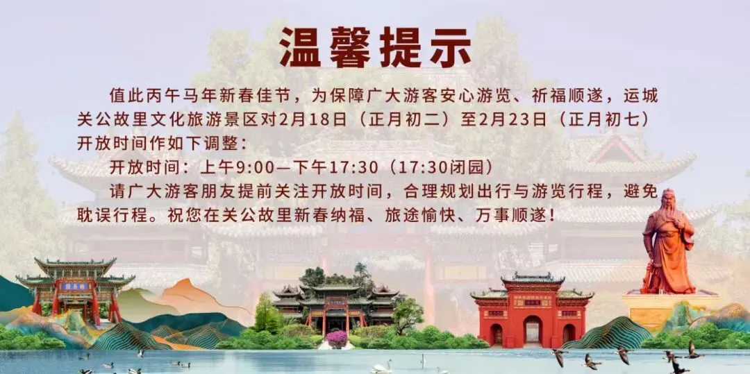 为应对春节假期客流高峰,让您享有更充裕的游览时间,关公故里文化旅游景区及常平关帝家庙景区将于初二至初七,将下午闭园时间延长至17:30。请您合理安排行程。