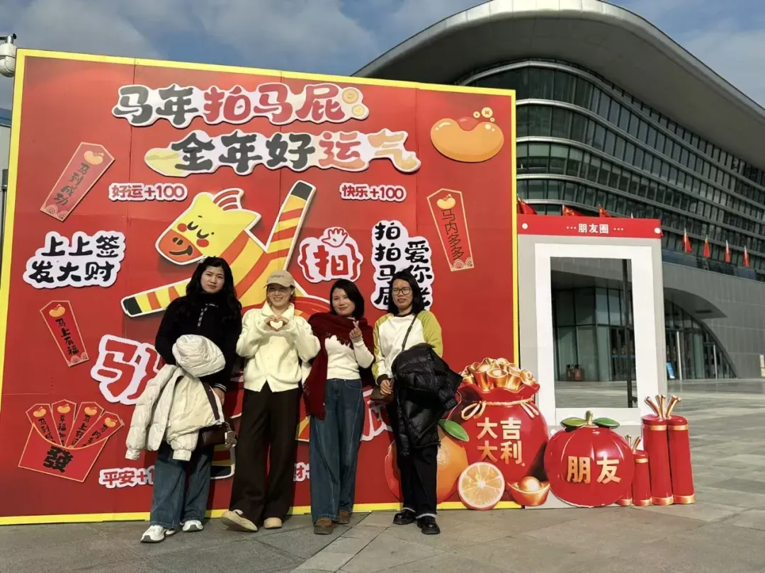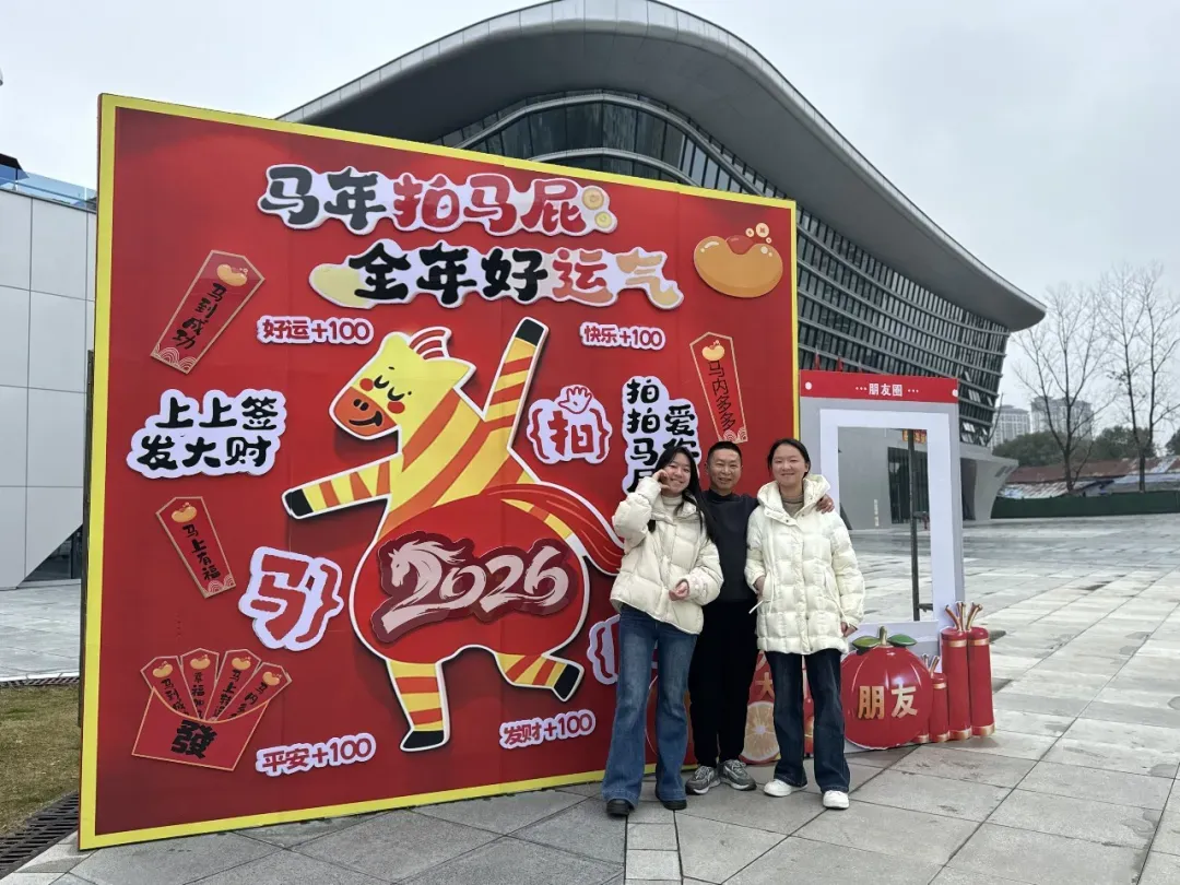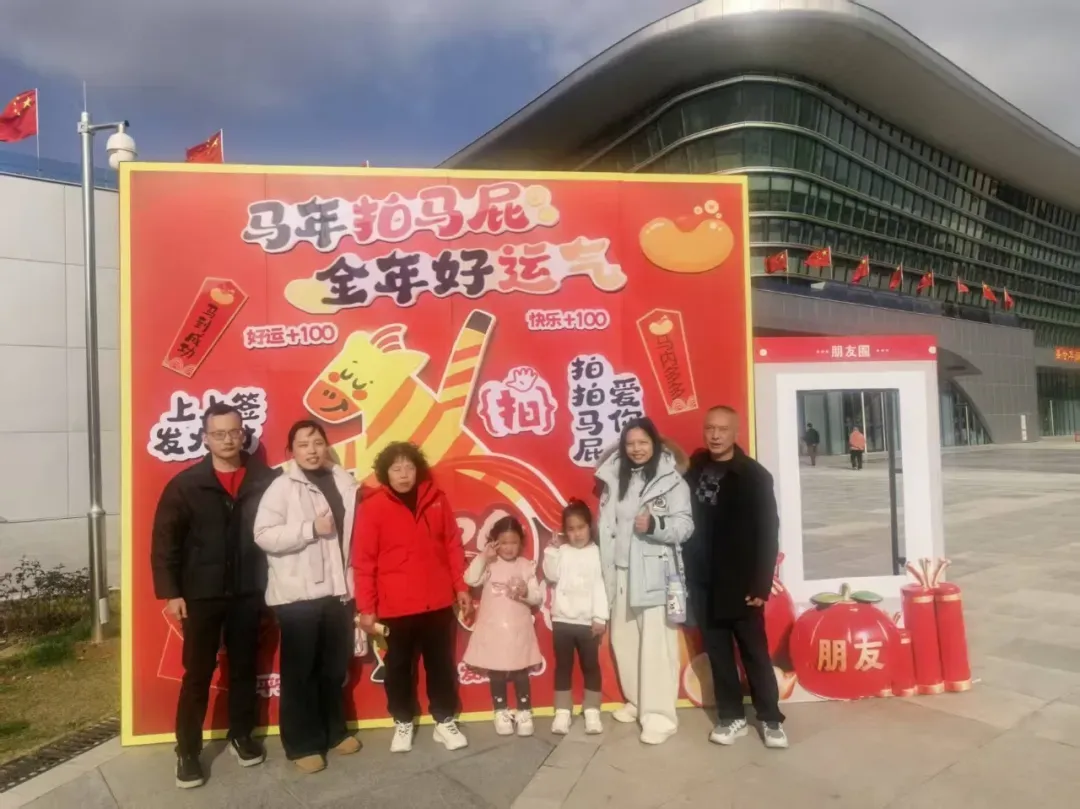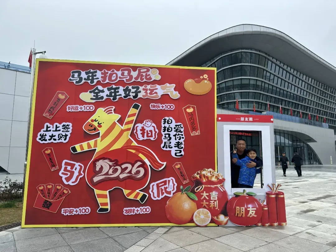 刚到红山体育馆门口,新春打卡装置前就排起了长龙。大家争相与萌趣小马合影,“马年拍马屁,全年好运气”的趣味标语下,全家福、好友合拍的快门声此起彼伏,定格新年第一份红火福气。